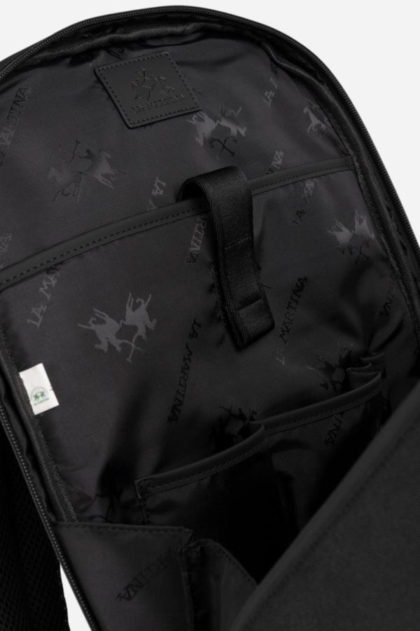 La mochila Mathias está fabricada en poliéster con acabados en PU, materiales elegidos para garantizar resistencia, ligereza y un estilo práctico y contemporáneo. En la parte delantera destaca el logo institucional de La Martina, aplicado sobre una etiqueta de goma, signo distintivo de la marca.El modelo cuenta con cierre metálico completo y tiene dos bolsillos frontales con cierre metálico y dos correas ajustables con cierre a presión, diseñadas para aumentar la funcionalidad y practicidad en el uso cotidiano. El interior está organizado con un compartimento de almacenamiento y un espacio dedicado para guardar el portátil, ideal para quienes buscan una mochila versátil adecuada tanto para el trabajo como para el tiempo libre.