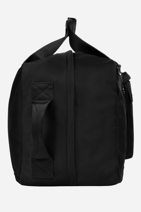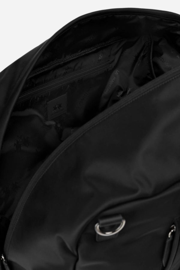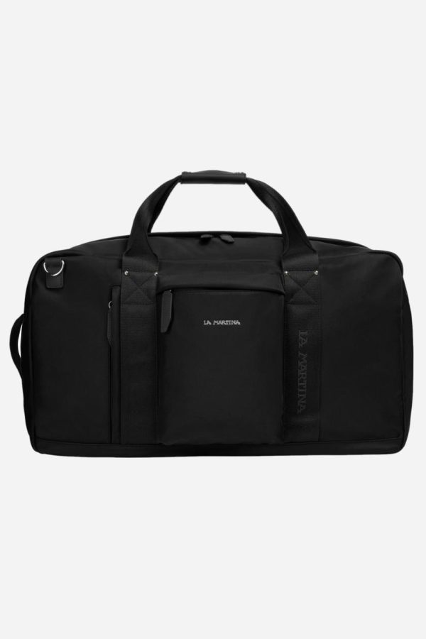 Borsone unisex in tinta unita, realizzato in nylon con rifiniture in poliuretano. Chiusura con zip. Presenti due tasche esterne, anch’esse dotate di chiusura con cerniera. Sul retro tasca con chiusura con bottone magnetico. All’interno sono presenti due tasche: una aperta e una con zip. Dotato di tracolla removibile. La scritta La Martina in metallo è applicata sulla parte frontale. Dimensioni (lunghezza x altezza x larghezza) 53 x 30 x 24 cm.