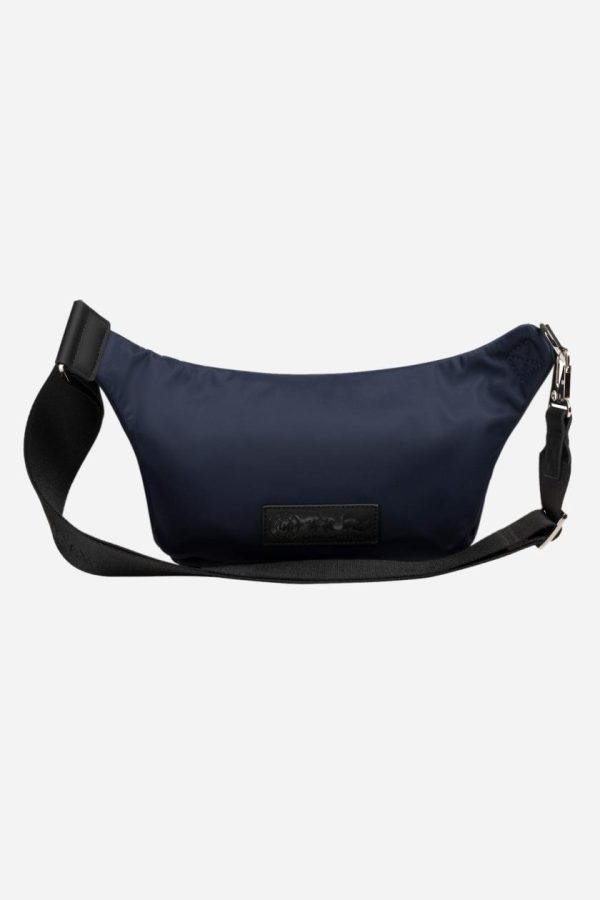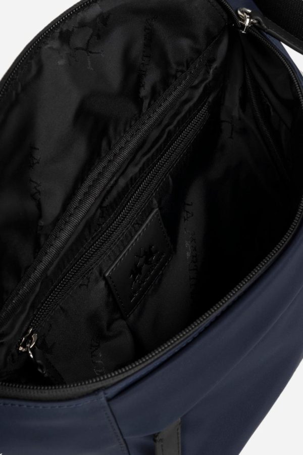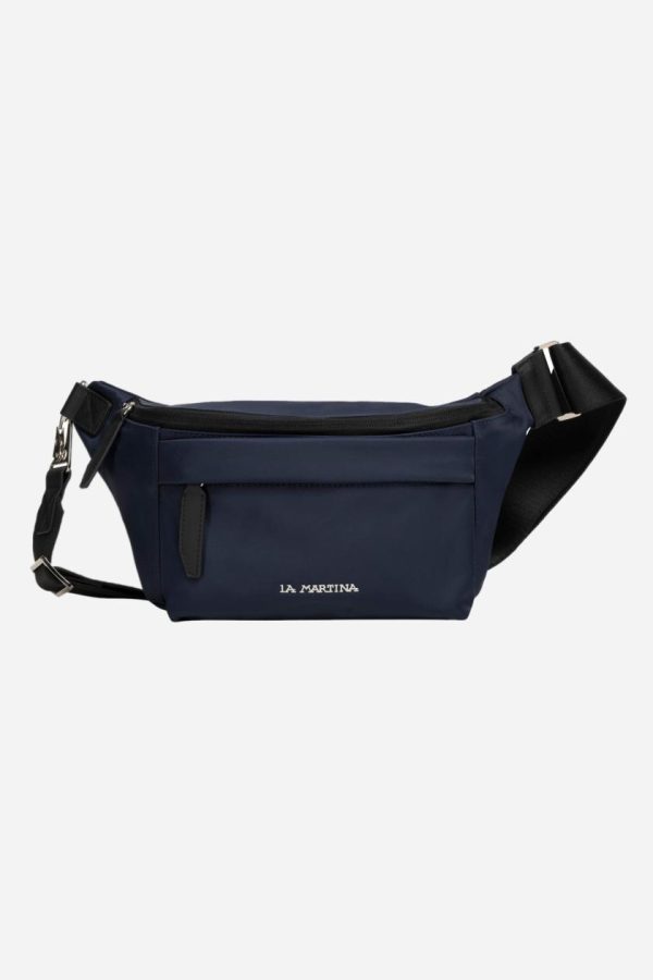 Men’s single-colour bumbag made of nylon with polyurethane trim. With zip fastening. There are two additional external pockets, one with a zip fastening and one with a magnetic button. Zip in a contrasting shade compared to the rest of the accessory. Adjustable fabric belt and snap-hook fastening. The inside features two pockets: one open pocket and one with a zip. The lettering “La Martina” is positioned on the front in metal. Dimensions (length x height x width) 35 x 14 x 7 cm.