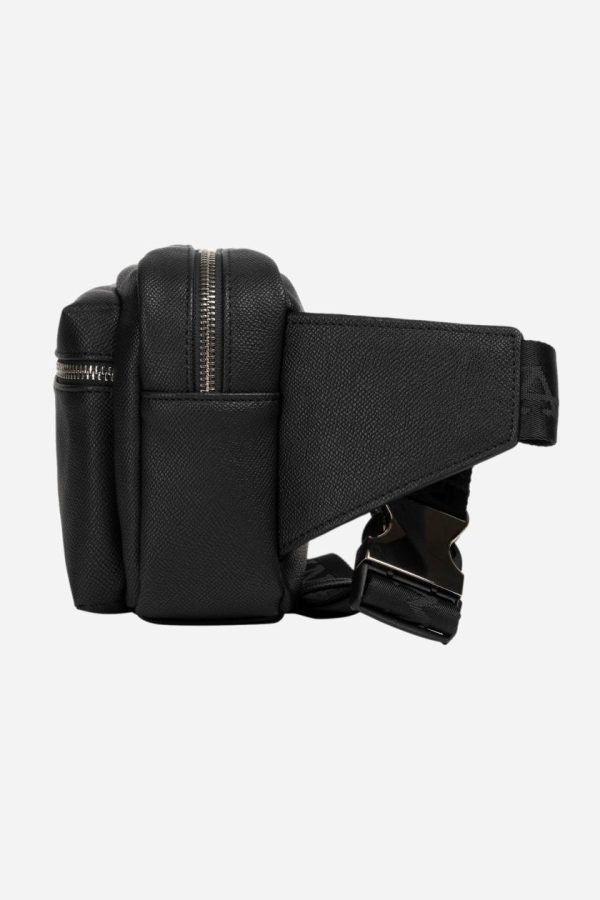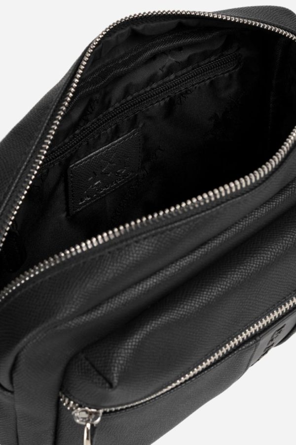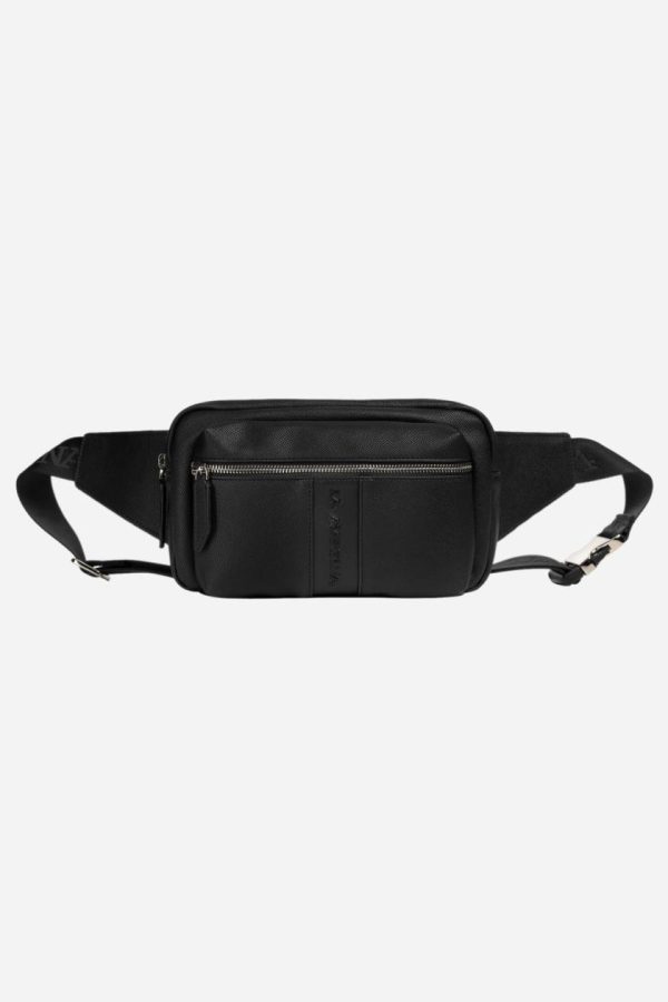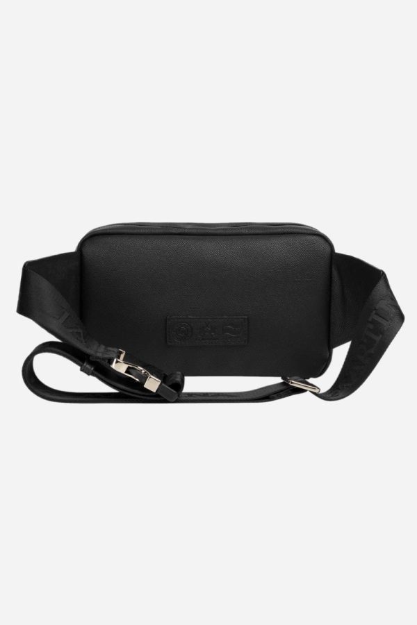 Single-coloured men’s bumbag made of polyurethane. With zip fastening. There is an additional external pocket, also with a zip fastener. Adjustable fabric belt, with the La Martina lettering, snap hook closure. The inside features two pockets: one open pocket and one with a zip. The lettering “La Martina” is positioned on the front in TPU. Dimensions (length x height x width) 25 x 15 x 8 cm.