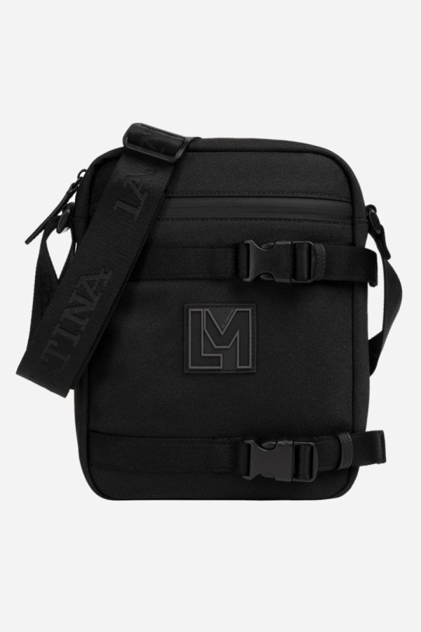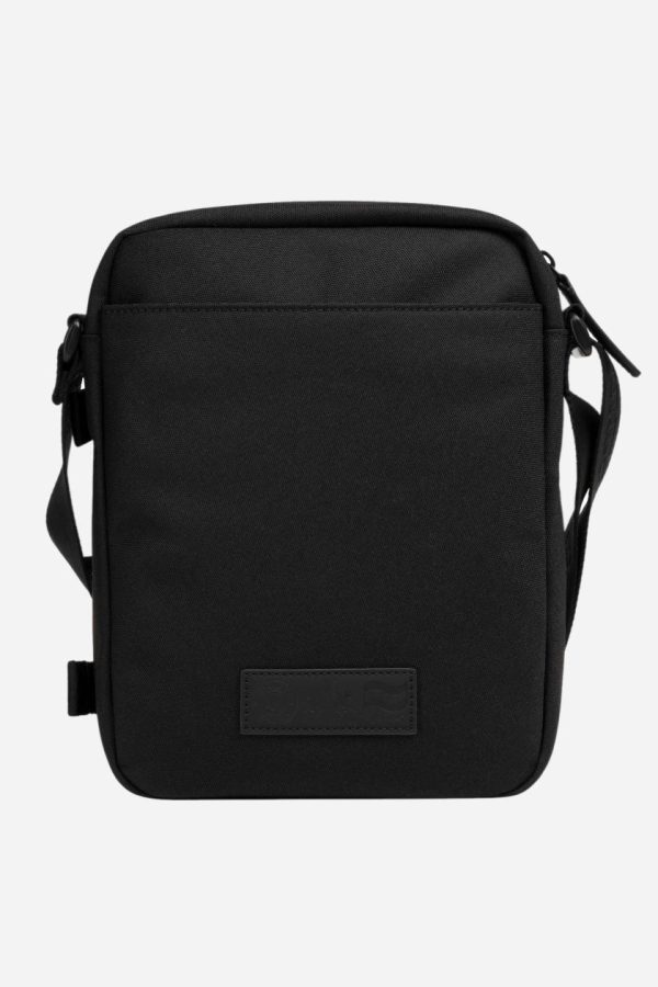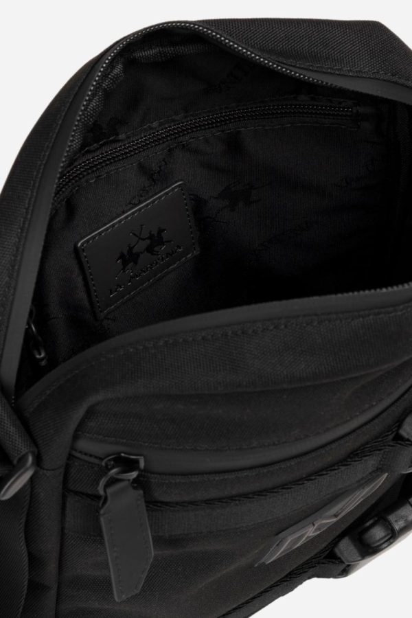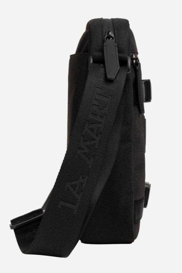 Men’s single-colour shoulder bag made of synthetic fabric with polyurethane trim. With zip fastening. There is an additional external pocket with a zip fastening. Adjustable fabric shoulder strap. On the back is another pocket with a pneumatic closure. On the front there are two contrasting decorative ribbons with a snap hook. The inside features two pockets: one open pocket and one with a zip. The brand initials appear on a rubber plaque positioned on the front. Dimensions (length x height x width) 21 x 27 x 7 cm.