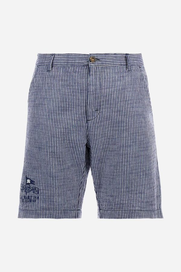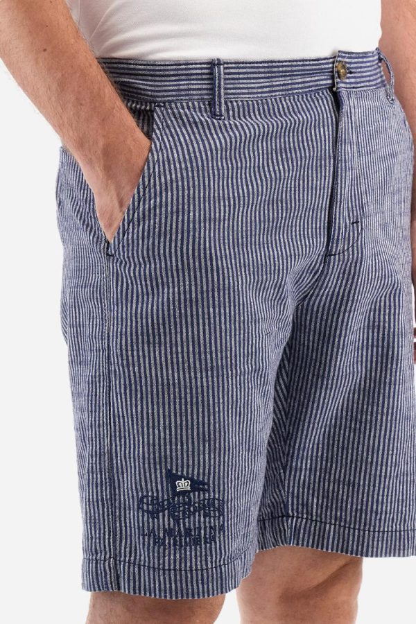 Striped men’s Bermuda shorts made from luxurious cotton and linen canvas. Fastened with a zip and faux horn button. The side pockets are slanted, while the double welt back pockets are feature visible faux horn buttons and double-needle stitching around the edges. Above the right back pocket, a woven label explains the brand’s quality certification. On the right hem, a graphic reading La Martina is embroidered in colourful thread. Regular fit. The model is wearing a size L.