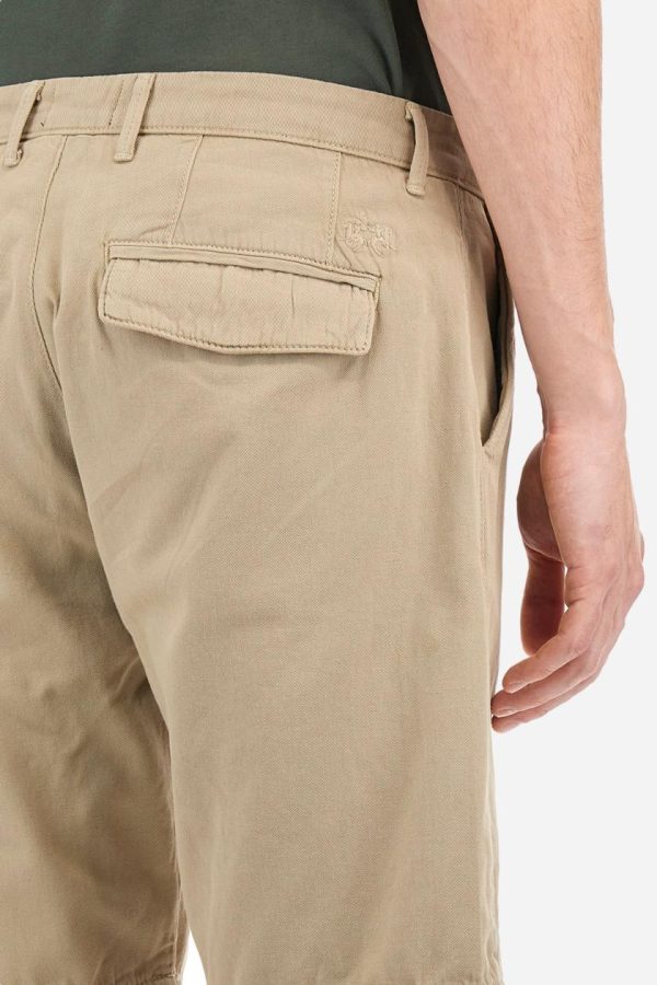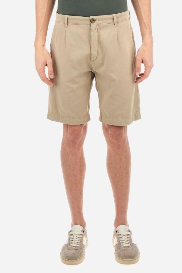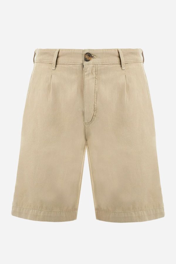 Men’s plain Bermuda shorts made from a refined blend of cotton and linen. Fastened with a zip and faux horn button. The side pockets are slanted, while the welt back pockets feature flaps and concealed buttons. The logo, in tone-on-tone embroidery, appears above the right back pocket. Regular fit. The model is wearing a size 33.
