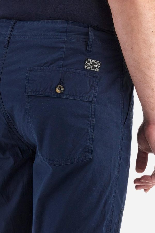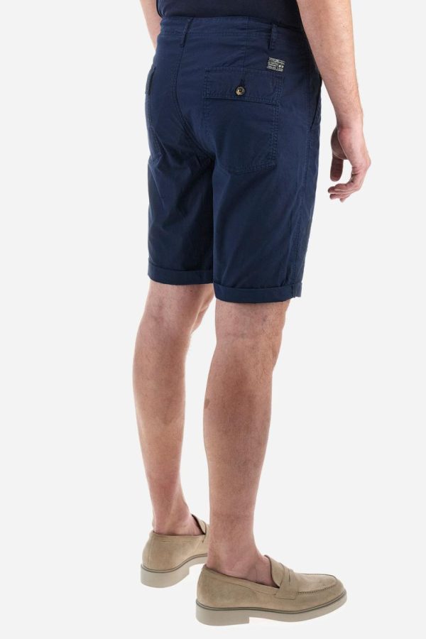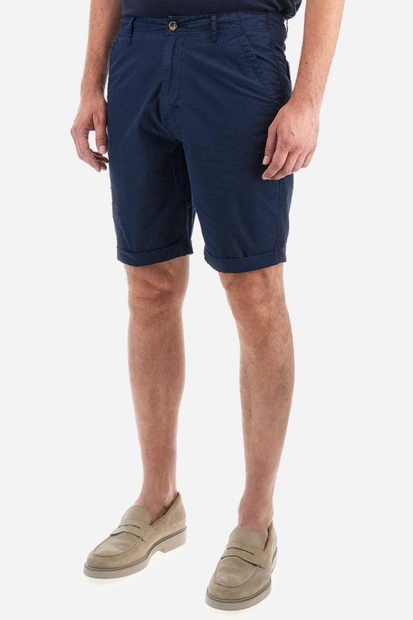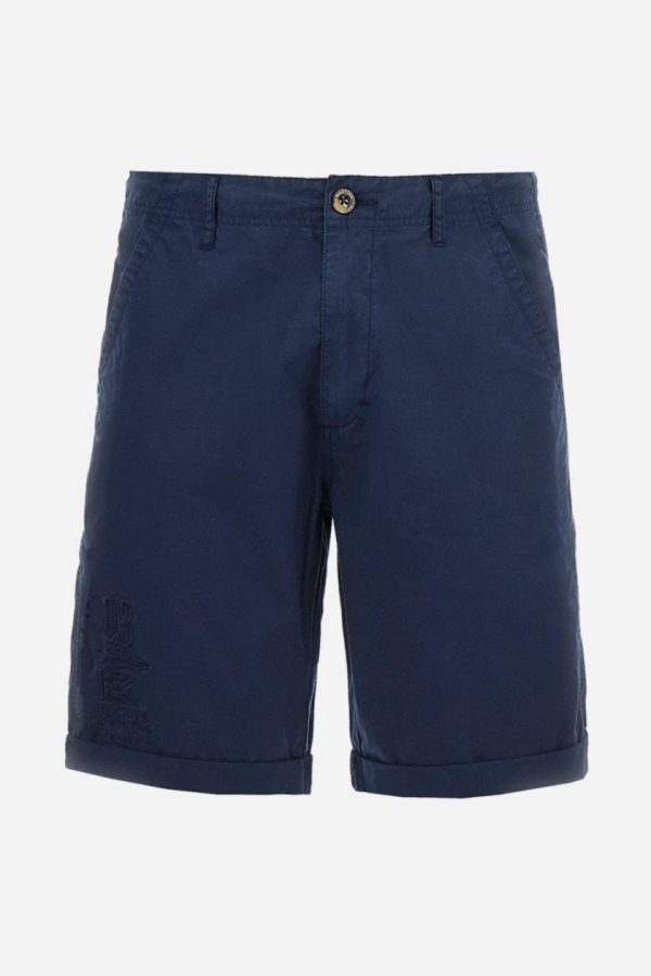 Men’s plain Bermuda shorts made from cotton poplin. Fastened with a zip and faux horn button, they feature turn-ups at the hems for a touch of style. The side slant pockets are extremely practical, and the flap patch pockets on the back are fastened with faux horn buttons. Above the right pocket, a woven label explains the brand’s quality certification. On the right leg, near the hem, there is an embroidered graphic with numbers and tone-on-tone lettering. Regular fit. The model is wearing a size 33.