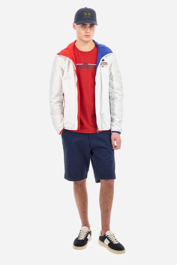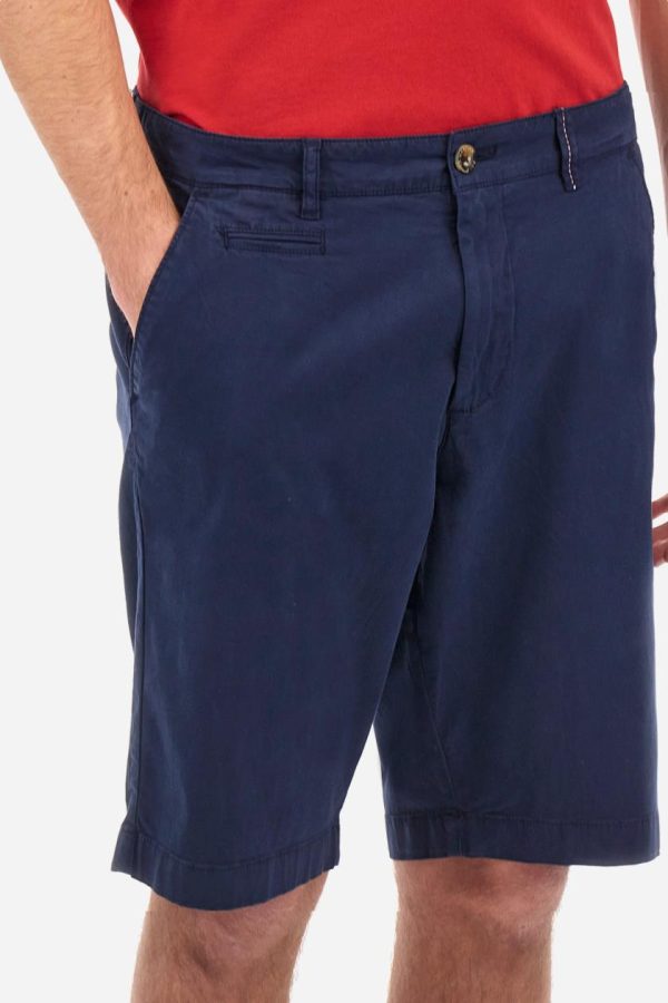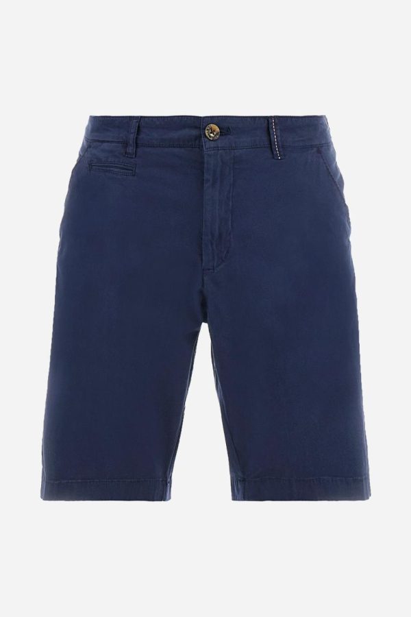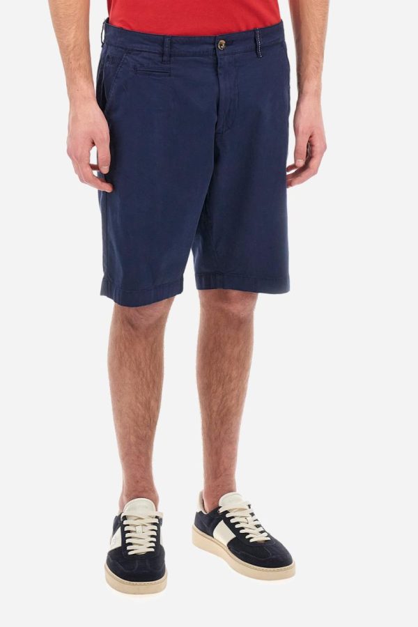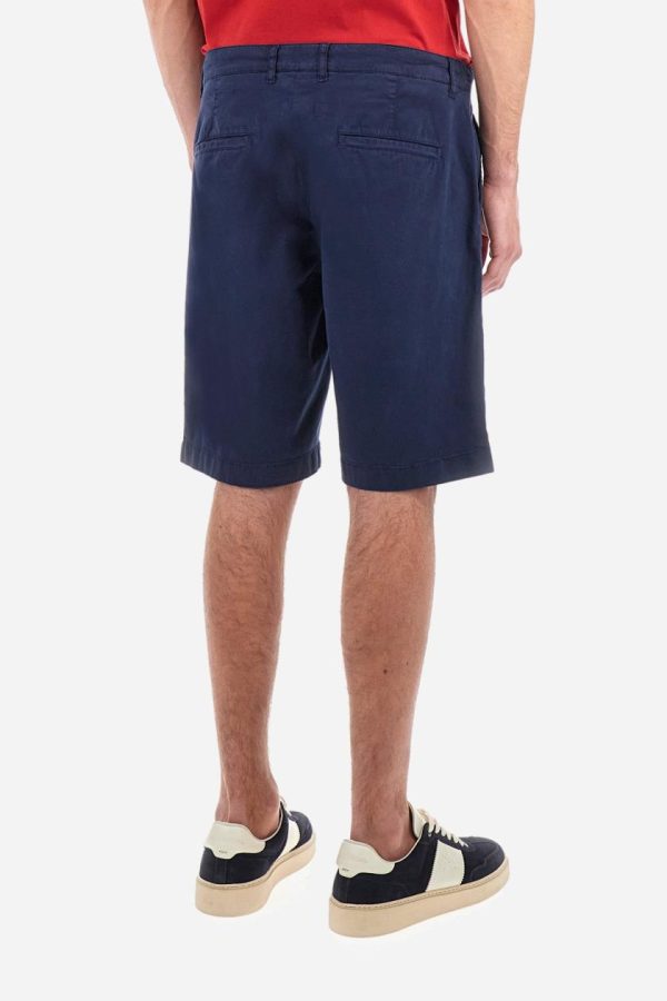 Men’s plain Bermuda shorts made from cotton twill. Fastened with a zip and faux horn button, they feature side slash pockets to complete the sleek and functional design. A handy welt coin pocket is located under the waistband on the right side. On the back, welt pockets continue the clean, elegant style. A tone-on-tone embroidered logo appears under the waistband at the opening of the right pocket. Regular fit. The model is wearing a size 33.