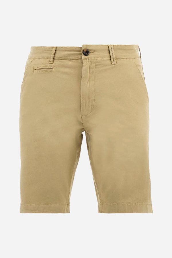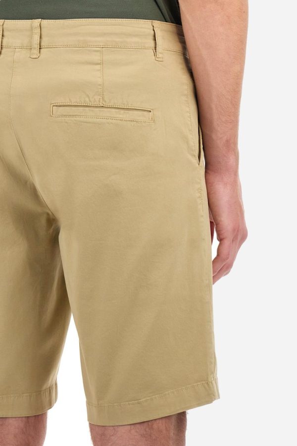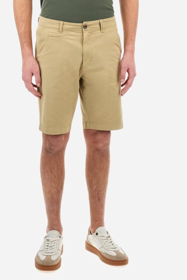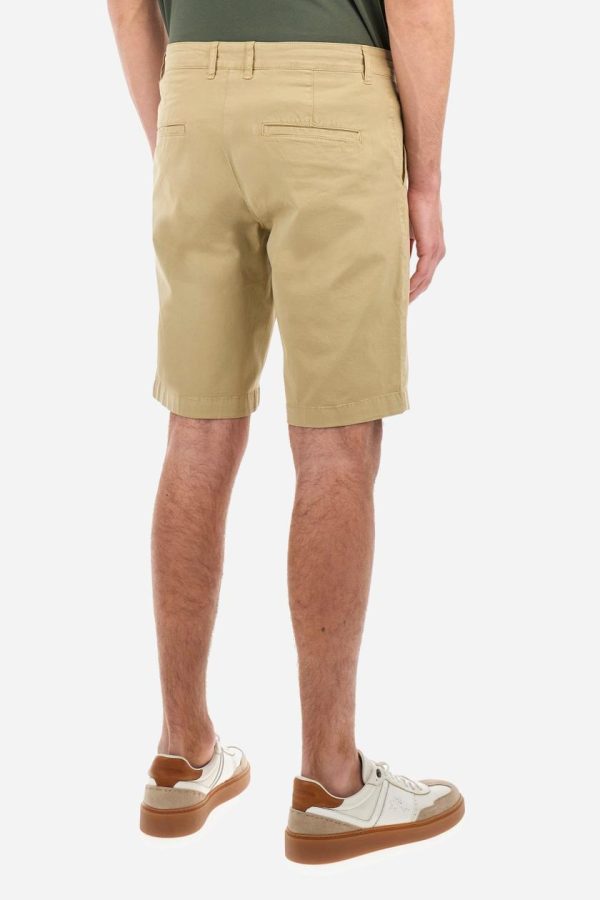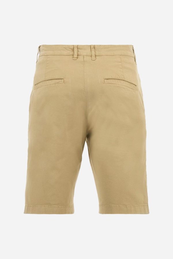 Men’s plain Bermuda shorts made from cotton twill. Fastened with a zip and faux horn button, they feature side slash pockets to complete the sleek and functional design. A handy welt coin pocket is located under the waistband on the right side. On the back, welt pockets continue the clean, elegant style. A tone-on-tone embroidered logo appears under the waistband at the opening of the right pocket. Regular fit. The model is wearing a size 33.