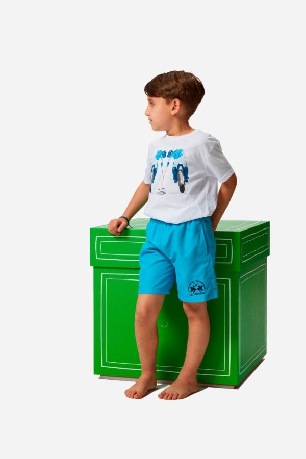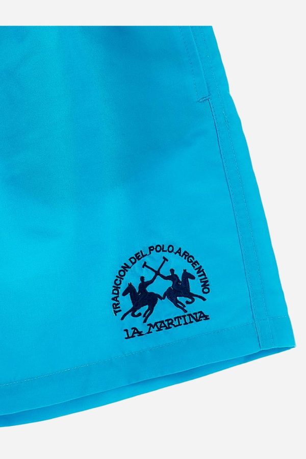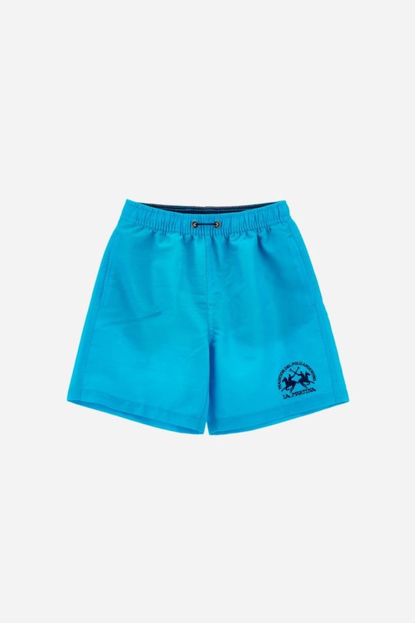 Single-colour boys’ costume made of synthetic fabric. Elasticated waist with fake drawstring. There are two slanted pockets on the front. An additional contrasting pocket is applied on the back. The logo is embroidered on the front.