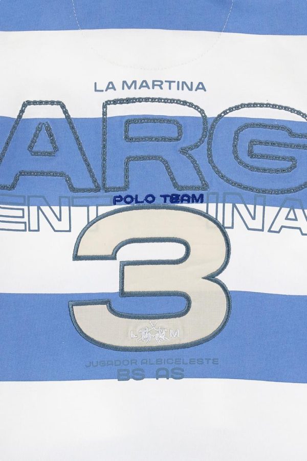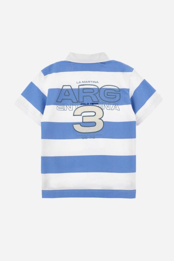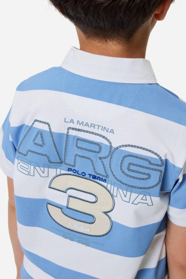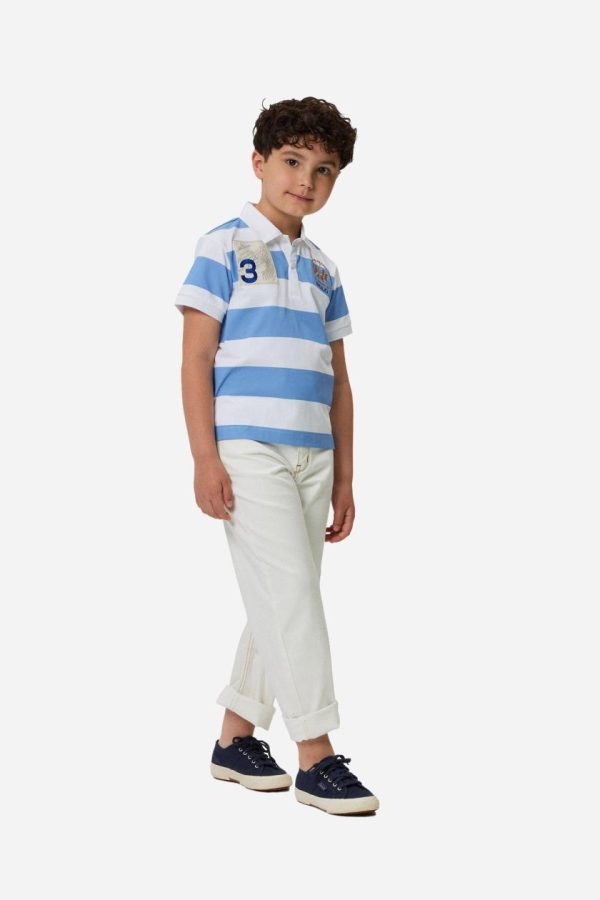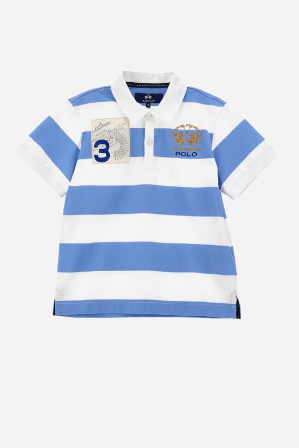 Boys’ striped polo shirt, made of cotton jersey. Two-button fastening. There are various embroideries on the front. The logo is present on the chest.