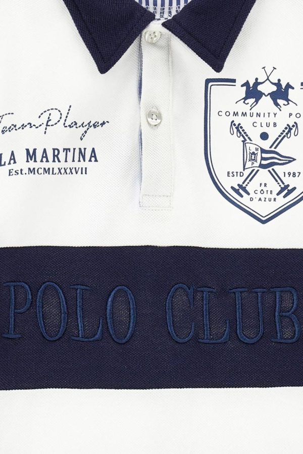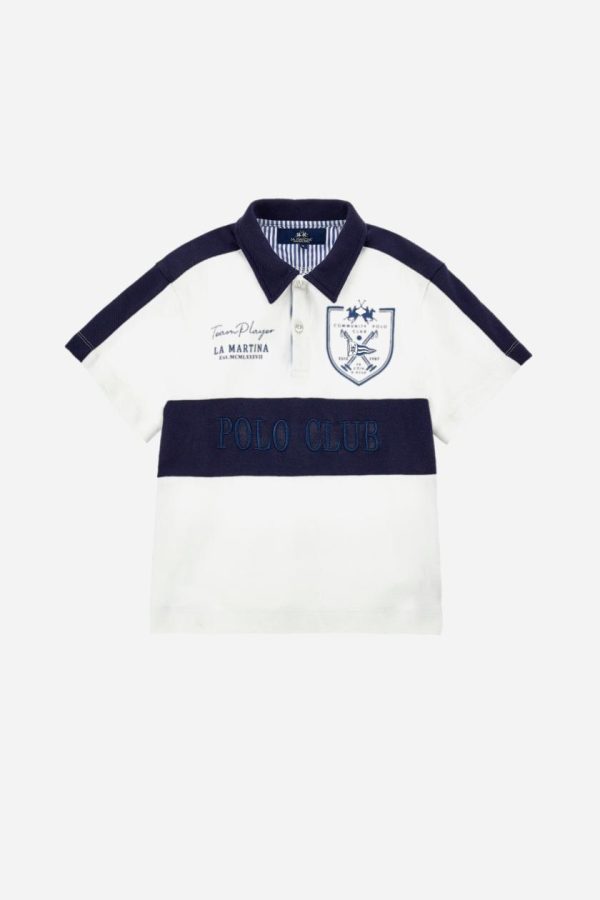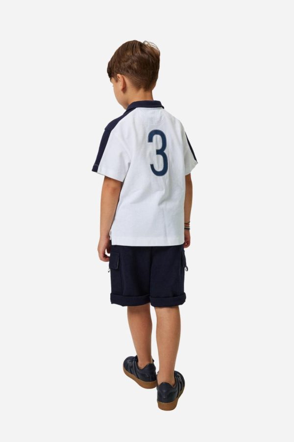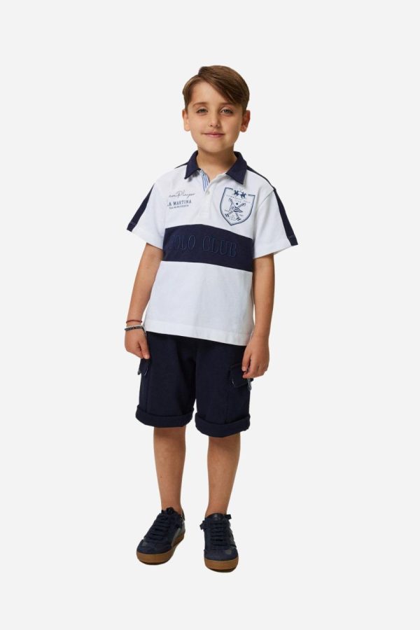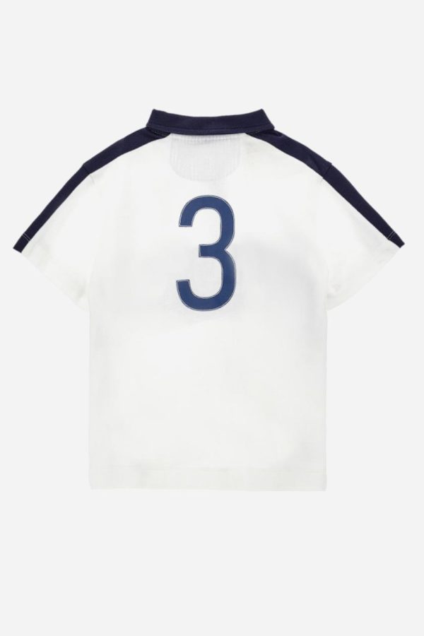 This boys’ two-tone polo shirt combines classic style with modern comfort. Made from quality pique cotton, it features a two-button fastening with contrasting ribbon for added sophistication. The garment showcases beautiful embroideries both front and back, with eye-catching contrasting bands on the central section, collar, and shoulders. Finished with a signature logo on the front for that perfect polished look.