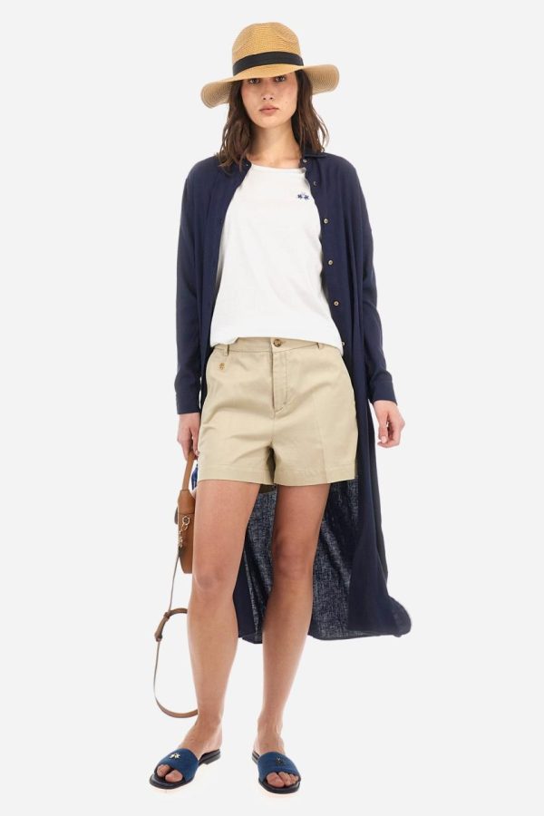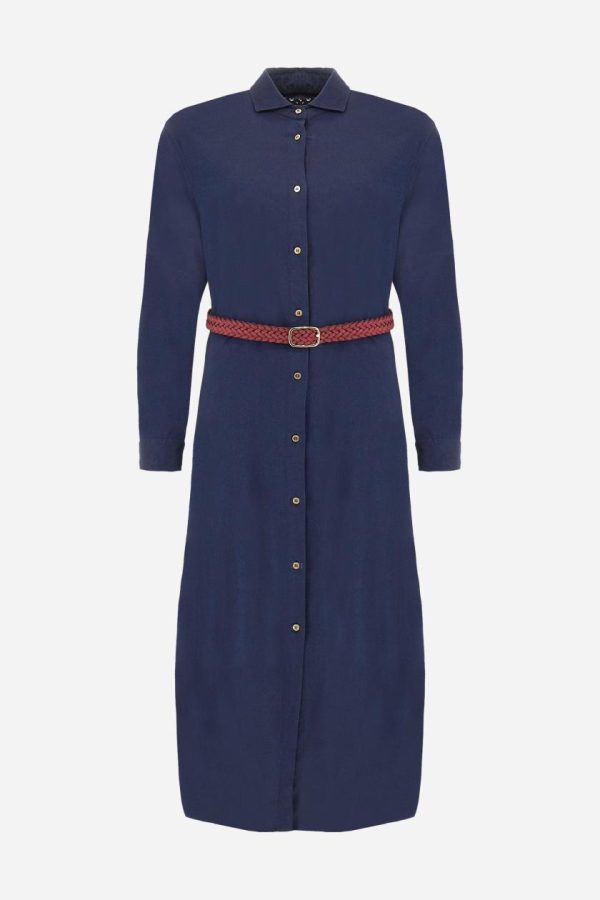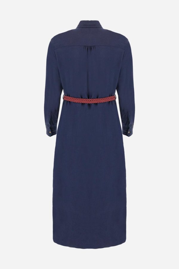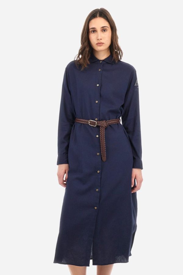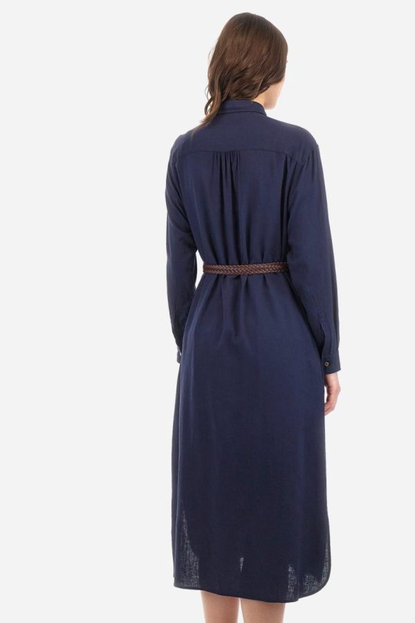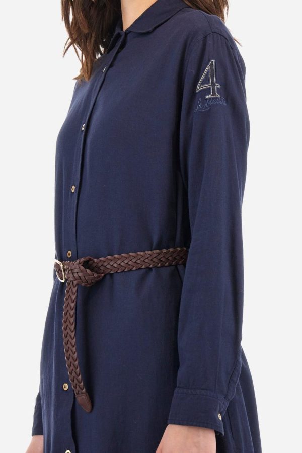 Long-sleeved dress in a single colour, made of linen and viscose canvas. Midi length, French collar and fastening with personalised gold metal buttons. Double side pocket at the side. Equipped with a braided eco-leather belt to be inserted into the belt loops at the waist. On the left sleeve there is a number 4 patch made of matching gabardine, applied with stitching embroidered with colour-contrasting metallic thread. Below it is the lettering La Martina embroidered with matching thread. The logo is represented on the metal plate applied under the right pocket. Regular fit. The model is wearing a size 2.