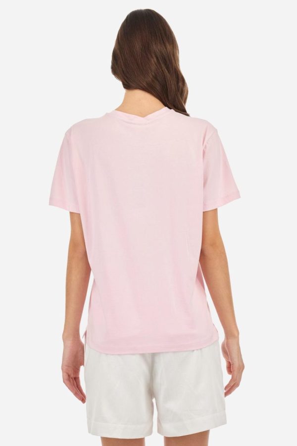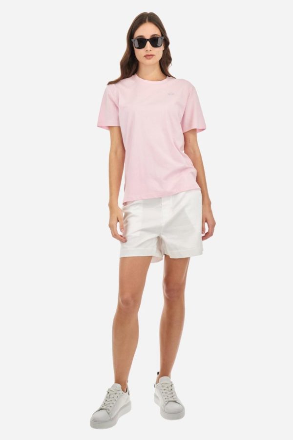 Single-colour short-sleeved women’s T-shirt made of cotton jersey. Crew neck. Featuring contrasting jersey necktape detailing inside. The logo is embroidered on the chest, left side. The fit is regular. The model is wearing a size 2.