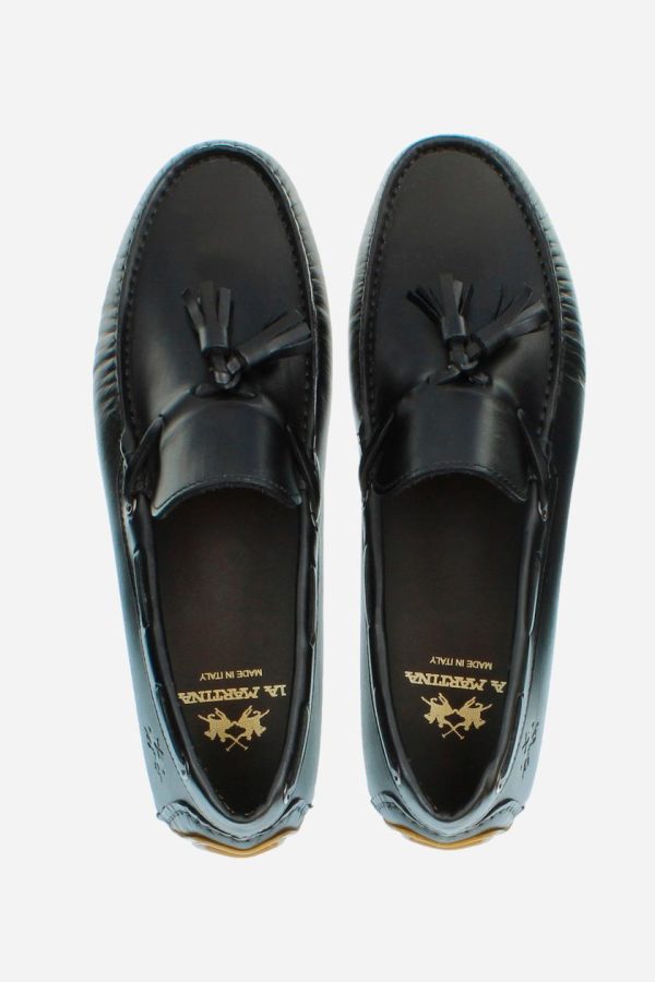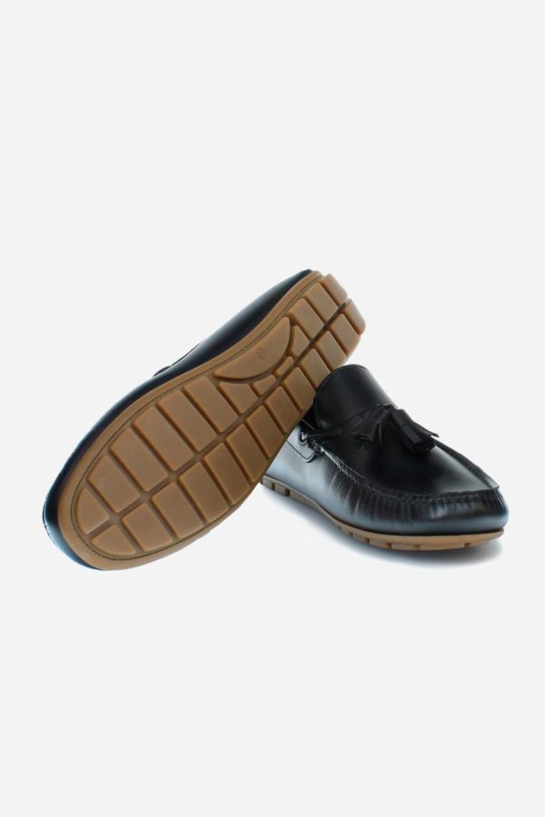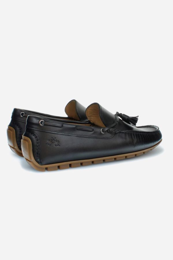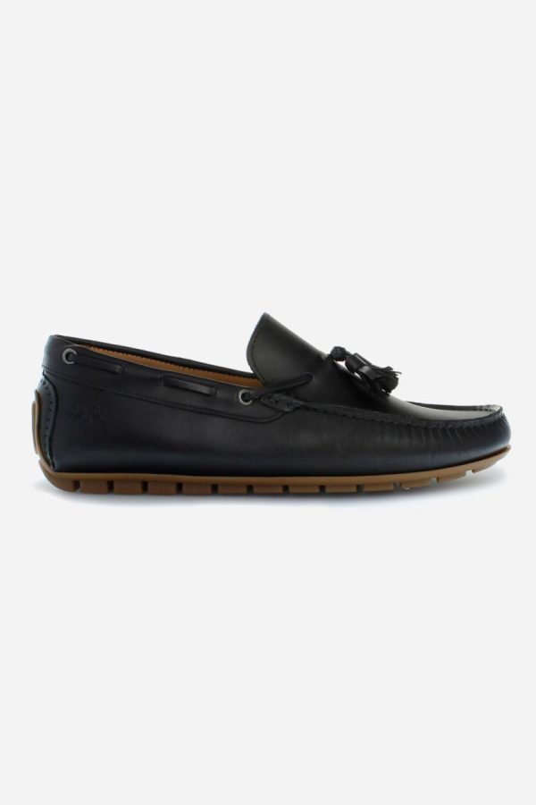 Soft leather loafer with a cord inspired by the boat shoe, ideal for an elegant and casual style. The sole with rubber tread guarantees grip and performance. The tonal cord with tassels, knotted on the vamp and threaded through metal eyelets, embellishes the design. The logo is embossed on the back. The hand stitching on the vamp and custom footbed reflect the craftsmanship of the shoe, ensuring a comfortable and refined fit.