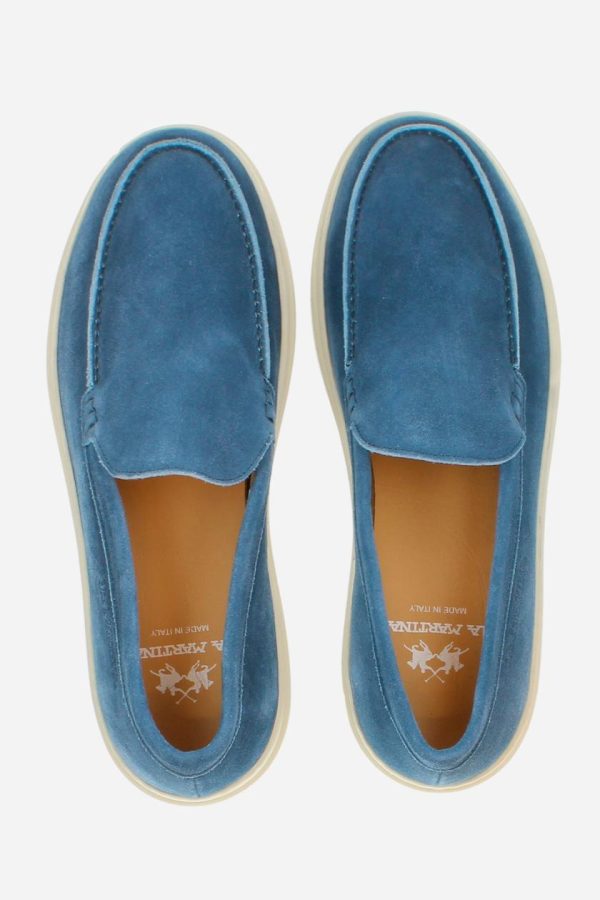 Slip-on loafer in soft faded suede, with a natural rubber sole. The STROBEL construction ensures greater comfort, extreme flexibility and perfect adaptability to the foot. The tonal La Martina lettering is embossed on the side, while the hand-sewn stitching along the entire vamp highlights the craftsmanship of the shoe. A design that combines elegance and practicality.