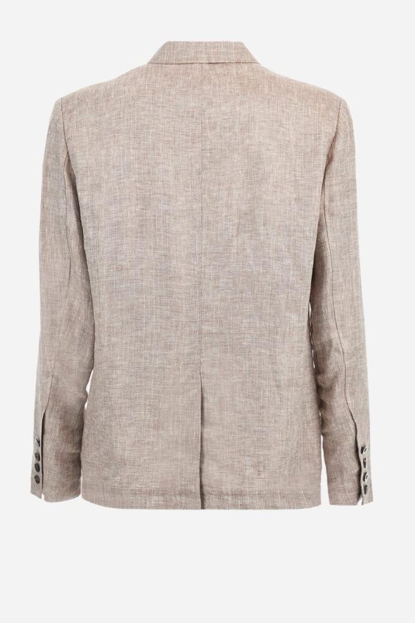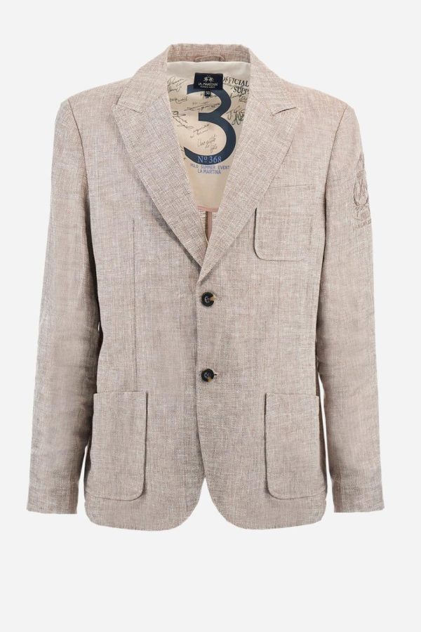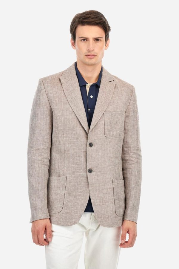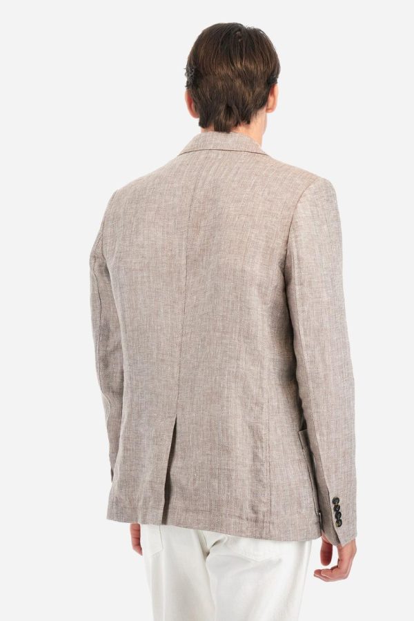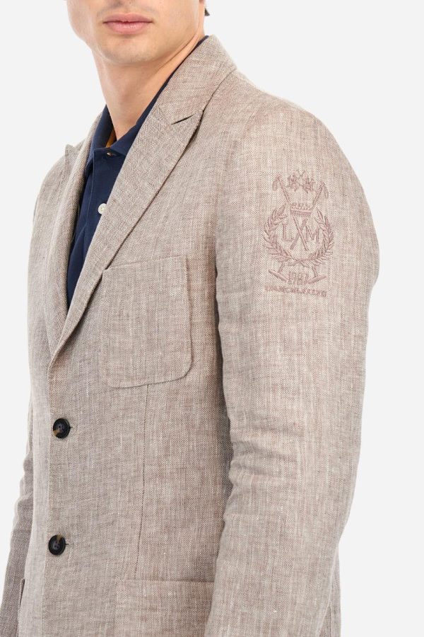 Men’s long-sleeved blazer in a single colour, made of 100% linen canvas. Peaked lapel neckline and two-button fastening. Patch pockets, two on the hips and one on the chest. The brand logo and initials are embroidered on the left sleeve. Regular fit. The model is wearing an Italian size 50.