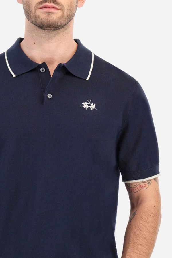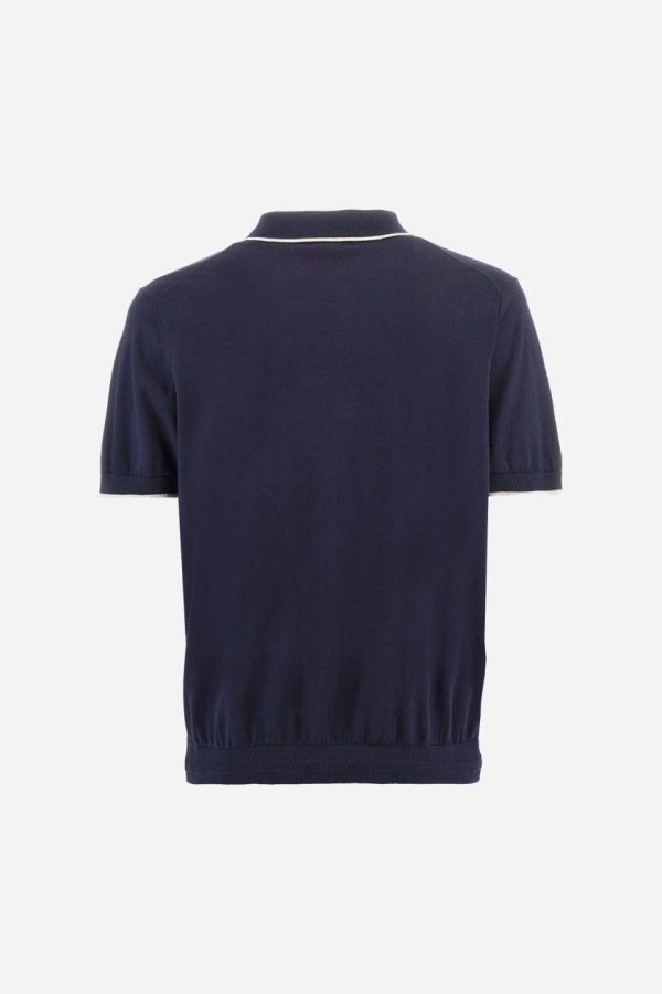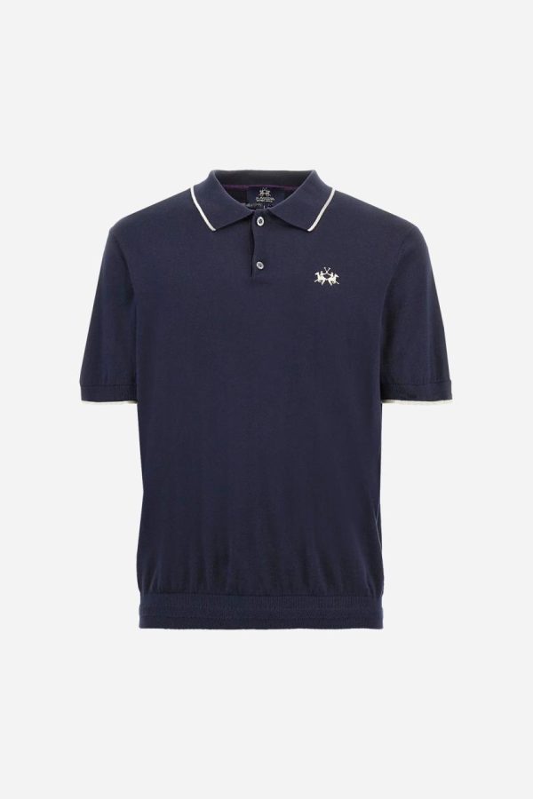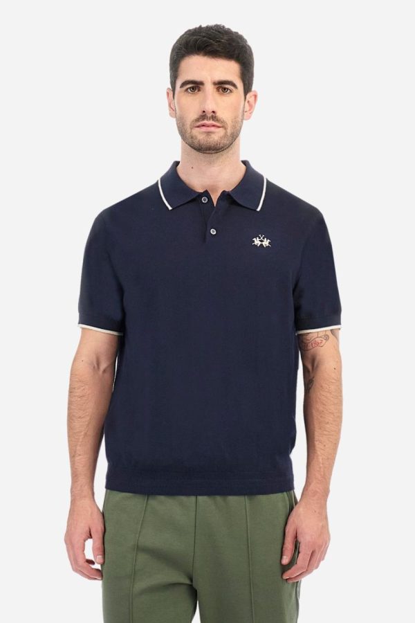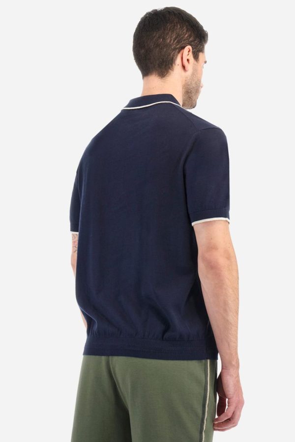 Single-colour men’s polo shirt with short sleeves. Made of knitted cotton yarn. Two-button fastening and ribbed collar with contrasting stripes on the bottom. The cuffs of the sleeves are ribbed, as is the band at the bottom, which is embellished in the centre with a band featuring a herringbone stitch. A contrasting coloured jersey ribbon is applied to the inside of the collar. The logo is embroidered on the left side of the chest in contrasting thread. Regular fit. The model is wearing a size L.