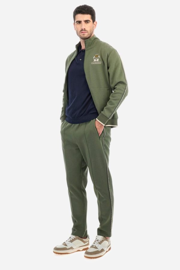 - Ribbed collar with contrasting stripes on the bottom and a contrasting coloured jersey ribbon on the inside.