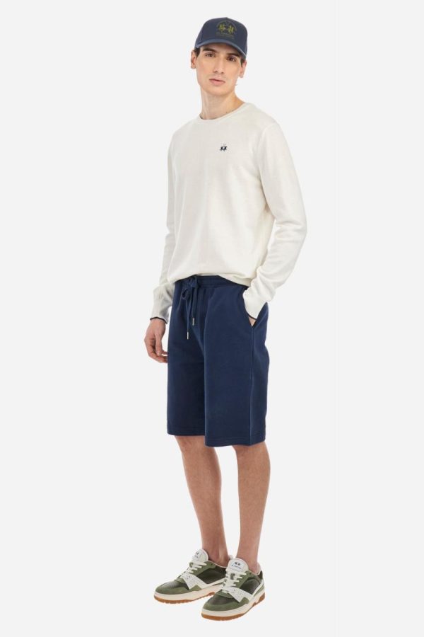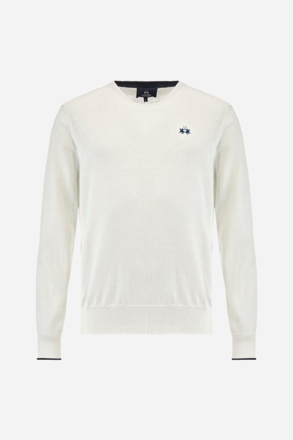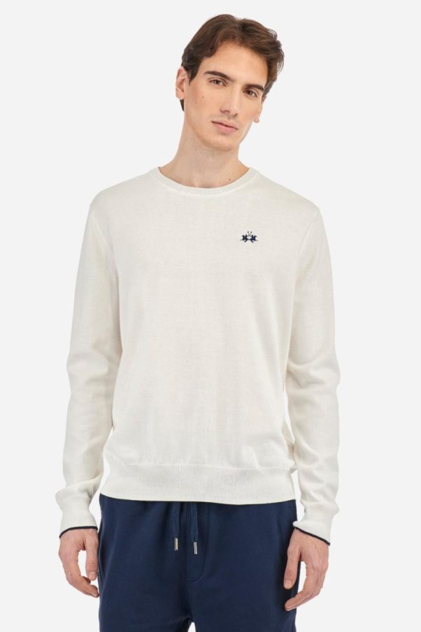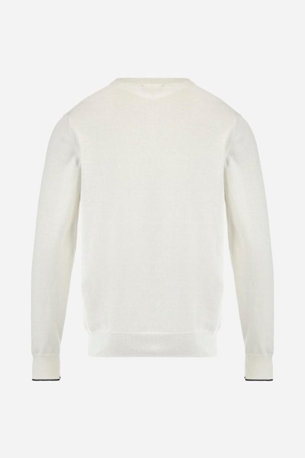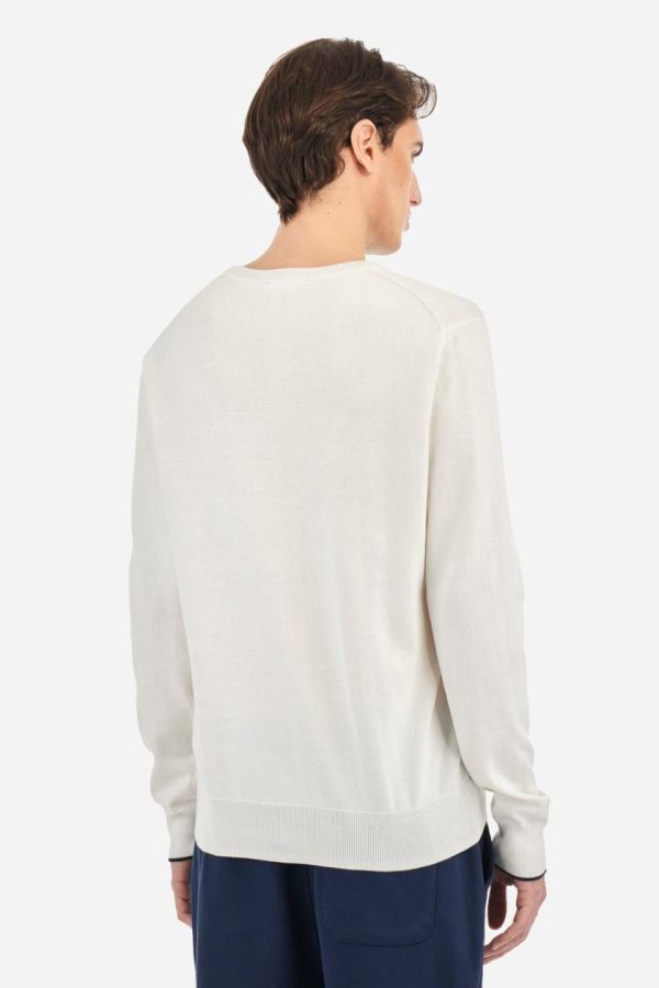 Men’s plain long-sleeved pullover made of 100% combed cotton yarn. The collar is in two-tone ribbed knit: the exterior features the same tone as the jumper while the interior is in contrast. The cuffs and the band at the bottom are also made of ribbed knit. The cuffs also feature a contrasting stripe on the edge as a decorative motif. The logo is embroidered on the left side of the chest in contrasting thread. Regular fit. The model is wearing a size L.