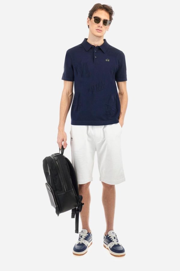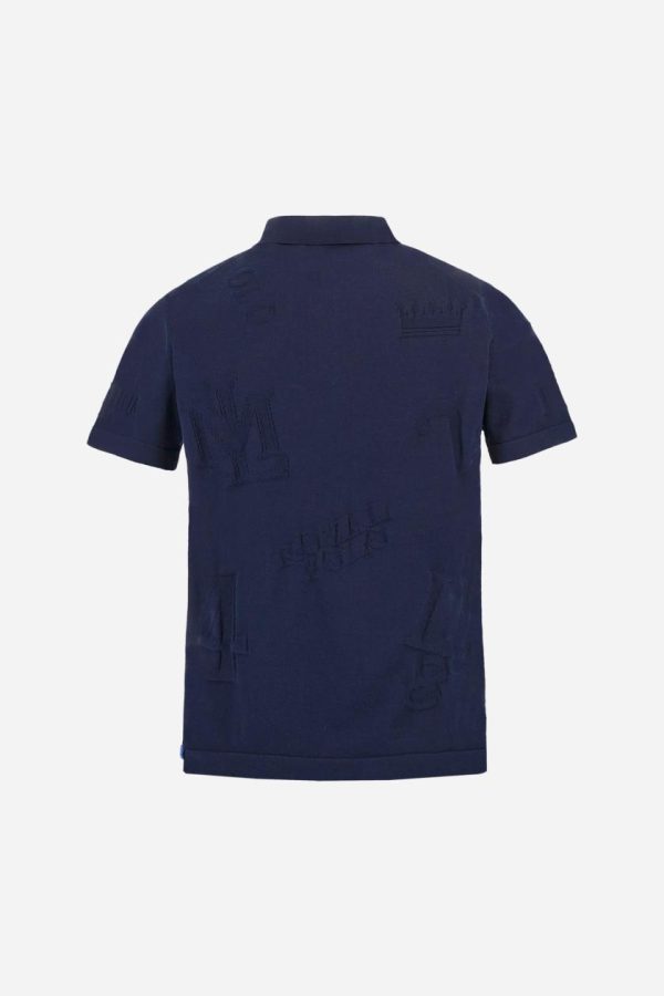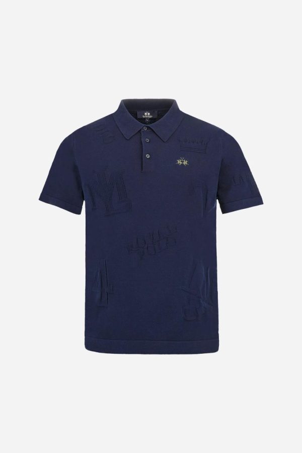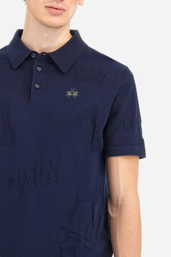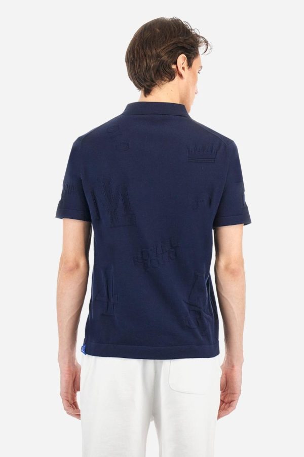 Elevate your casual wardrobe with this men’s short-sleeved knitted polo shirt crafted from premium 100% combed cotton yarn. Features a refined three-button placket with vertical rib detailing inside the opening. Showcases artistic graphics created using precision inlay technique for a distinctive look. The subtle tone-on-tone embroidered logo adds sophisticated branding. Designed with a classic regular fit that provides comfortable, versatile styling. The model is wearing a size L.