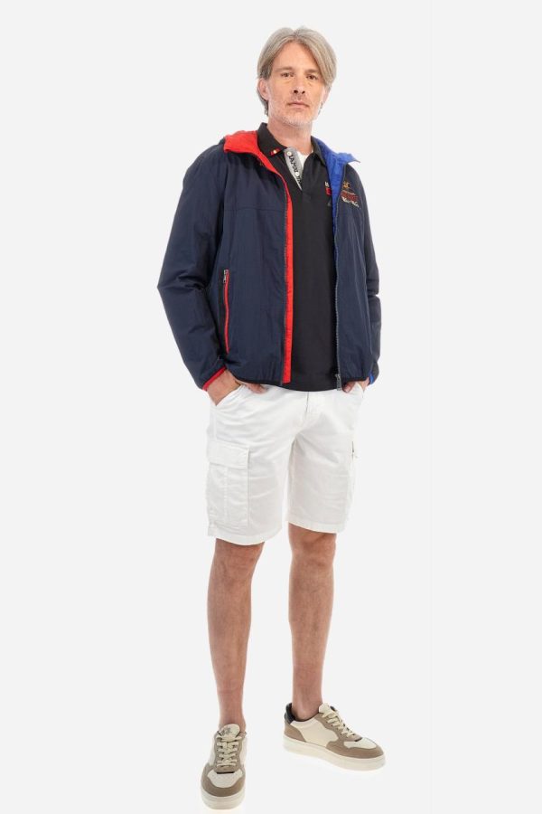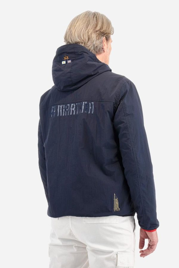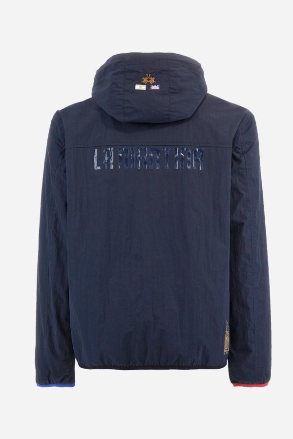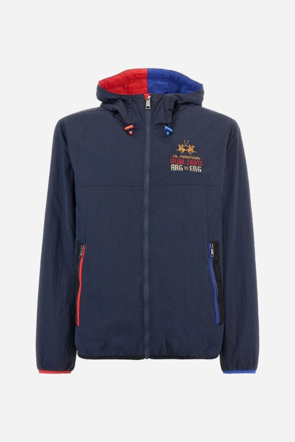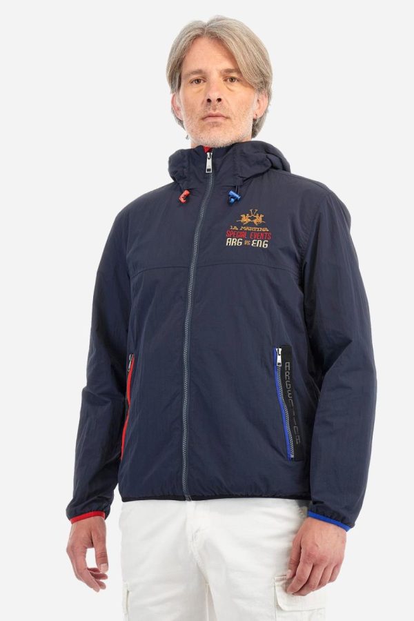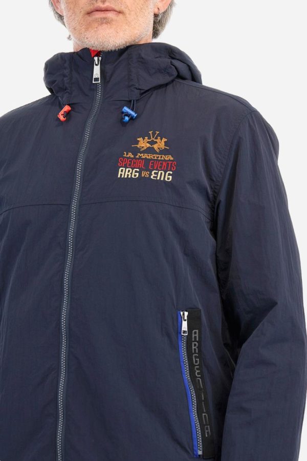 Men’s long-sleeved jacket in a versatile single colour, complete with adjustable hood. Crafted from durable ckinckle nylon. Features a full-zip fastening for easy wear. There is an internal lining in dual-tone nylon. Premium two-tone detailing is also present on the zips of the vertical pockets on the front, the cord clips on the hood and the elasticated piping at the cuff end. Adjustable hood on the opening, featuring an elastic drawstring. Eye-catching glossy transfer print applied on the back. Multi-coloured embroidered graphics featured on the hood and left chest. The distinctive La Martina logo and lettering is embroidered on the front. Regular fit for all-day comfort. The model is wearing a size L.