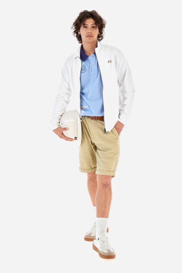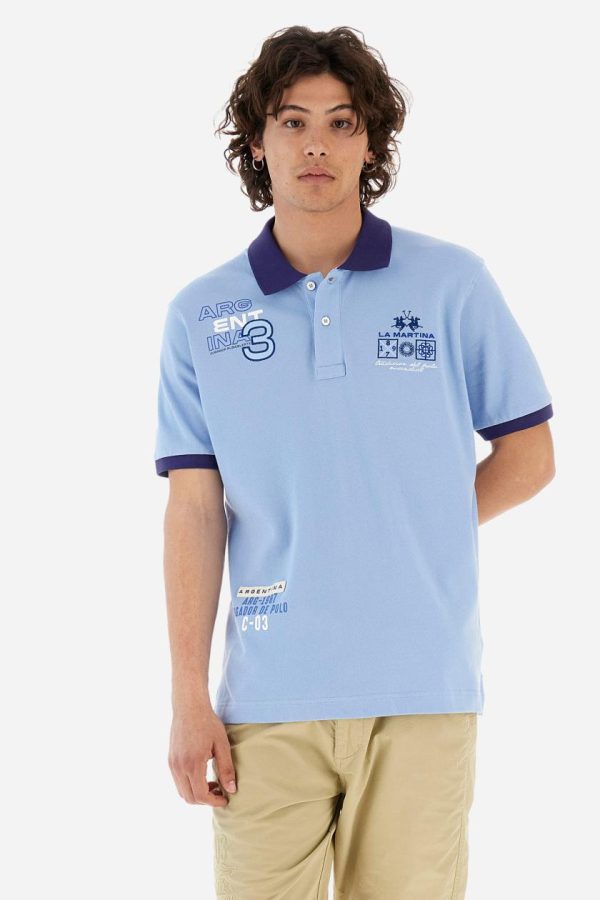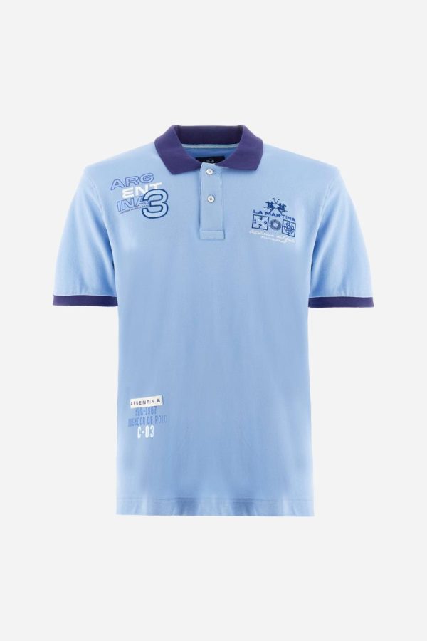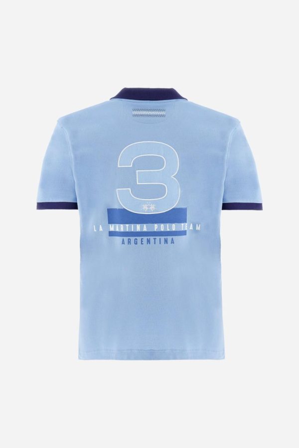 Elevate your casual wardrobe with this men’s premium polo shirt made from high-quality cotton piqué. Features a sophisticated two-button closure and contrast ribbed detailing. Inside the collar there is a two-tone grosgrain ribbon with the colours of the Argentine flag. The front showcases a striking print of the lettering Argentina with a fabric patch of the number 3 applied with a contrasting embroidered cord, while on the left side of the chest the eye-catching multicoloured logo embroidery is accompanied by Argentina-inspired writing and logos. The back of the polo shirt makes a statement with a large fabric patch of the number 3, applied with embroidered cord and with the small logo embroidered on the inside in a contrasting colour. Also features distinctive lettering and patches with an Argentina-inspired theme. Regular fit provides comfortable, versatile styling. The model is wearing a size L.