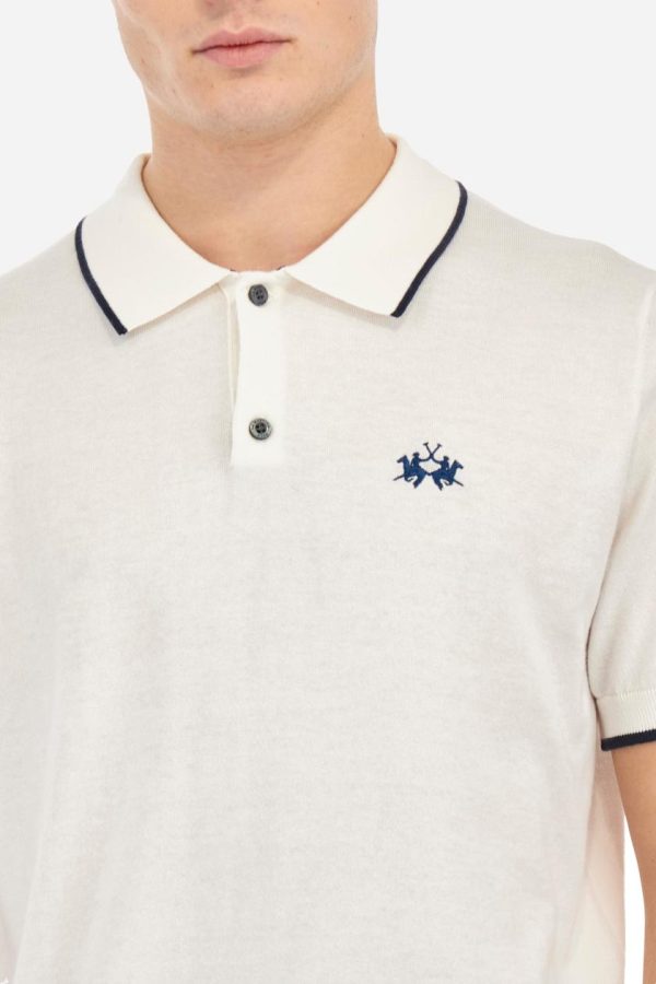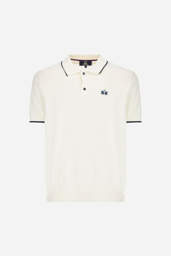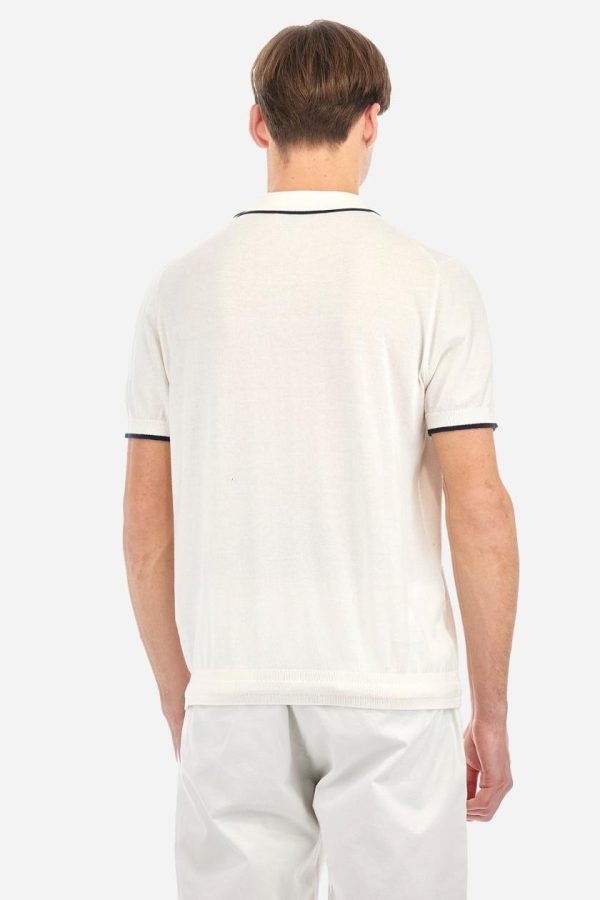 Elevate your casual wardrobe with this single-colour men’s polo shirt featuring comfortable short sleeves. Expertly crafted from premium knitted cotton yarn for superior comfort and durability. Features a two-button fastening and ribbed collar with stylish contrasting stripes. The cuffs of the sleeves are ribbed, as is the band at the bottom, which is enhanced with a sophisticated band featuring a herringbone stitch. A contrasting coloured jersey ribbon is applied to the inside of the collar for added refinement. The logo is embroidered on the left side of the chest in contrasting thread. Regular fit provides comfortable, versatile styling. The model is wearing a size L.