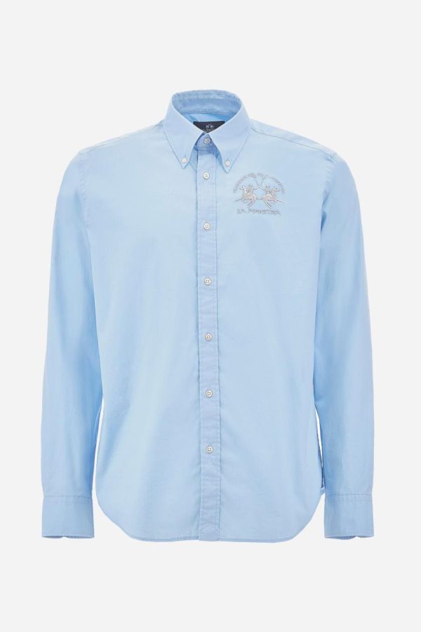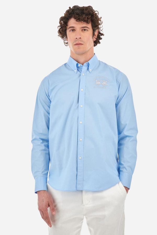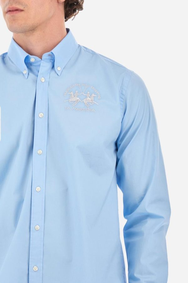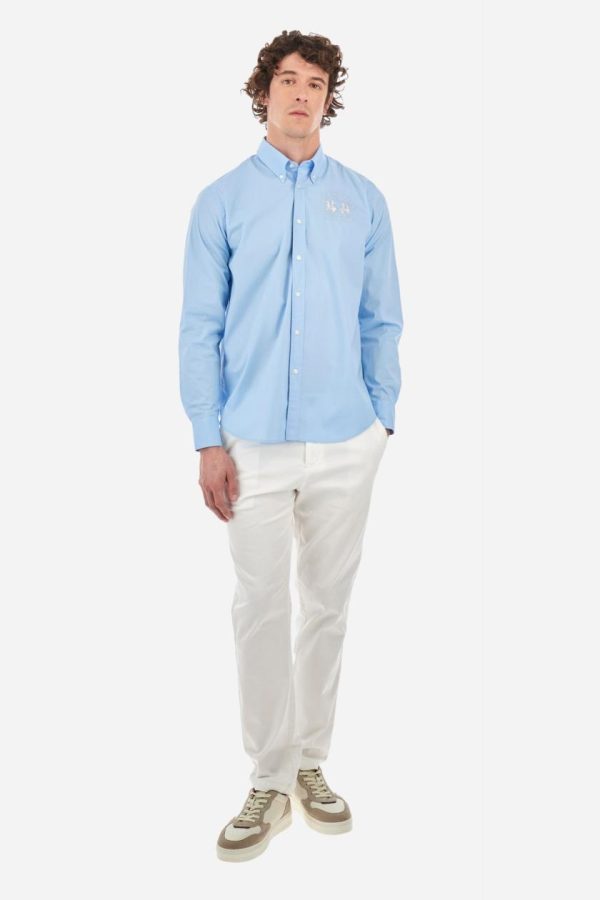 Men’s long-sleeved, regular-fit button-down collar shirt featuring a timeless cut. Showcases a contrasting La Martina logo embroidered on the chest for elegant distinction. Perfect for pairing with your favorite jeans or dress trousers for any occasion.