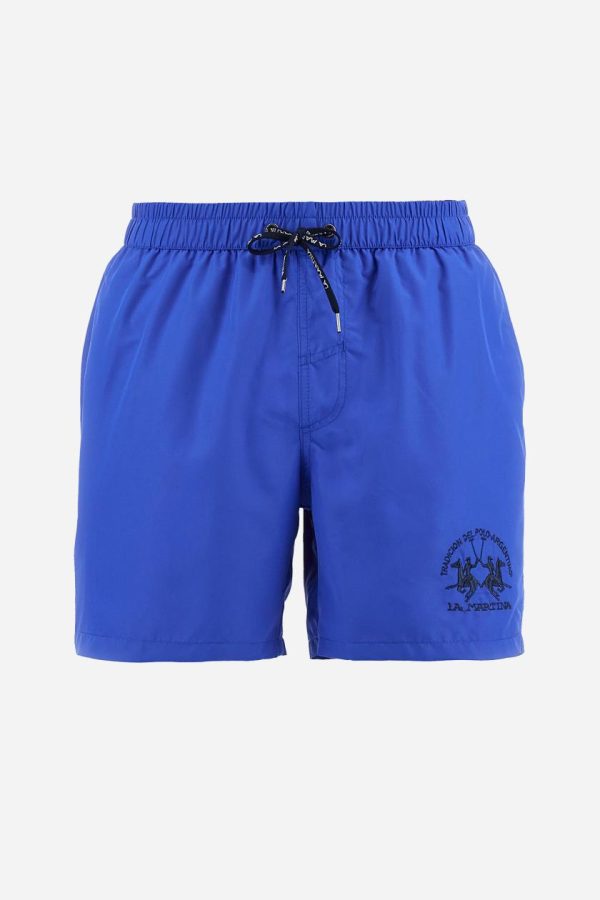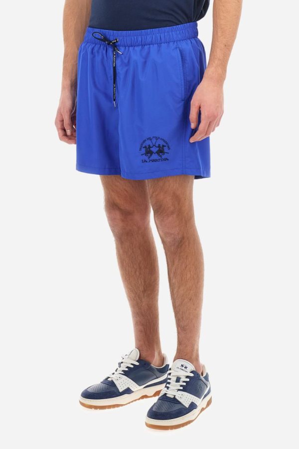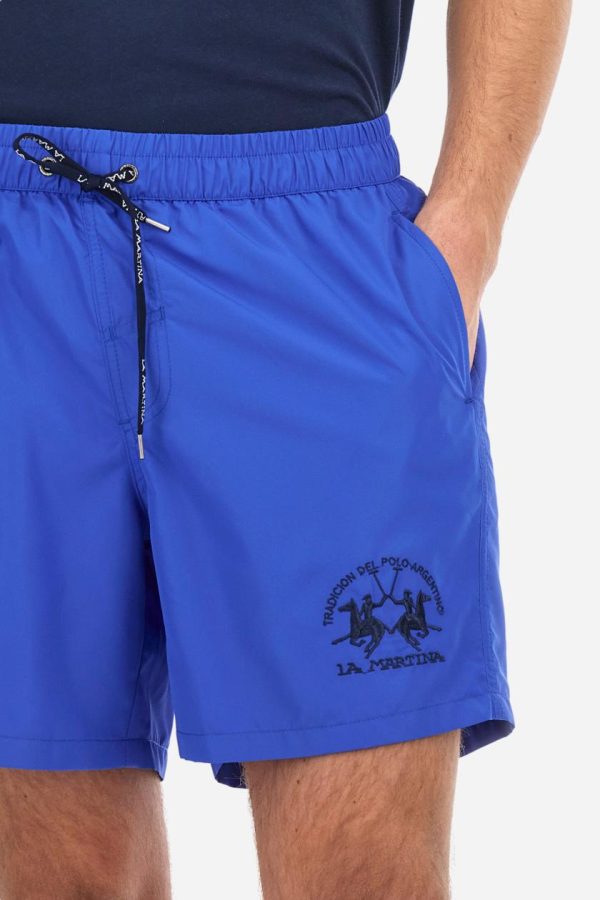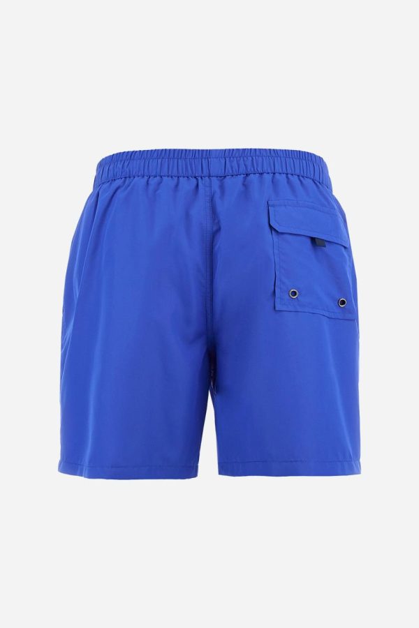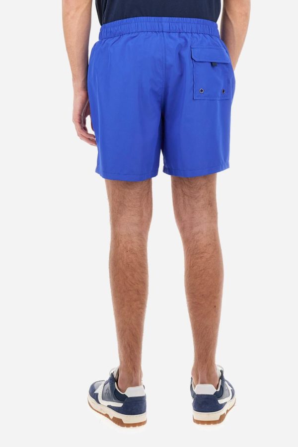 Stylish men’s swimming shorts crafted from high-quality nylon fabric. Features an elastic waistband with a personalised drawstring for adjustable comfort. On the inside of the shorts is an elasticated mesh brief for added support. Double side pocket on the hips and patch pocket with flap on the back, on the right side only for convenient storage. The large logo is embroidered in a contrasting colour thread on the bottom of the left leg on the front for premium brand appeal. Regular fit provides comfortable movement and versatile styling. The model is wearing a size L.