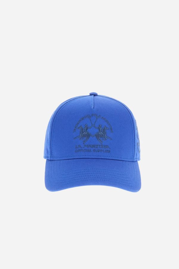 Classic cotton twill baseball cap featuring six-panel construction with embroidered eyelets for superior breathability. The front showcases an eye-catching large La Martina Official Supplier logo, expertly embroidered in contrasting colors for maximum visibility. The right side features a stylish patch in matching fabric, accented with contrasting embroidered cord detailing. Signature La Martina lettering is prominently embroidered above the back opening. The adjustable metal buckle ensures a perfect, comfortable fit for any head size.