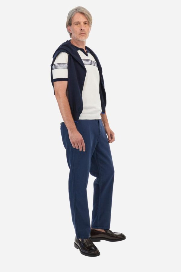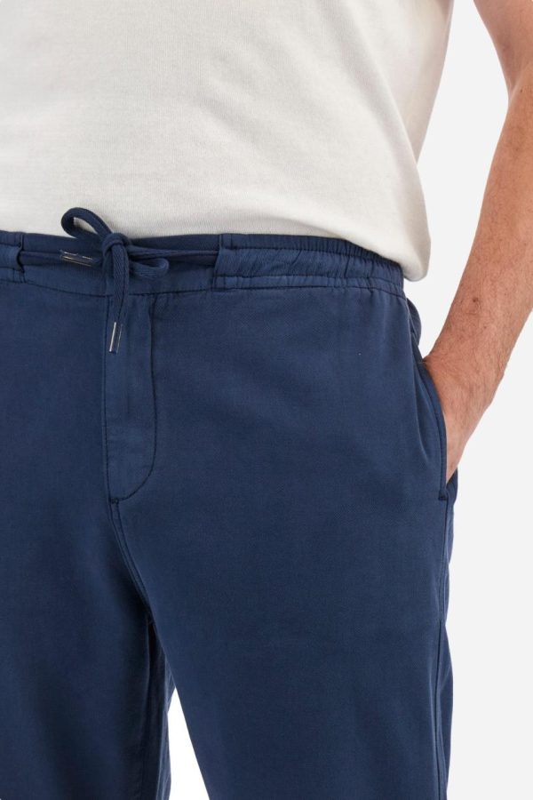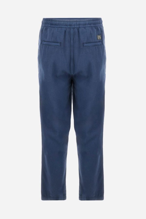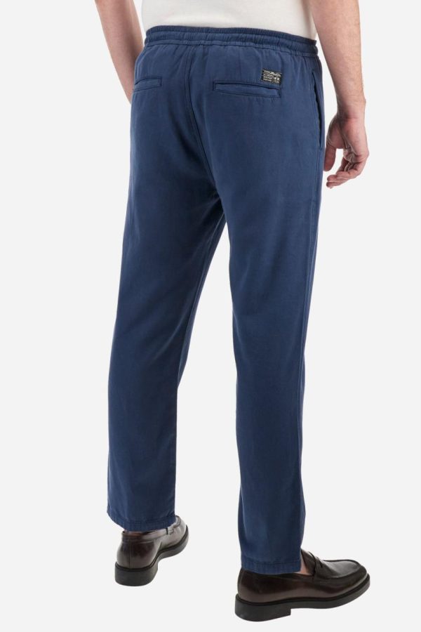Elevate your wardrobe with these premium straight-cut trousers, expertly crafted from breathable linen and cotton canvas. Features an innovative adjustable waist system with elasticated drawstring for superior comfort. The sophisticated front opening combines a stylish faux horn button with smooth zip closure. Practical double welt side pockets provide ample storage, complemented by two additional welt pockets on the back. The distinctive logo is showcased on the woven label above the right back pocket. Designed with a versatile regular fit that flatters every build. The model is wearing a size L.