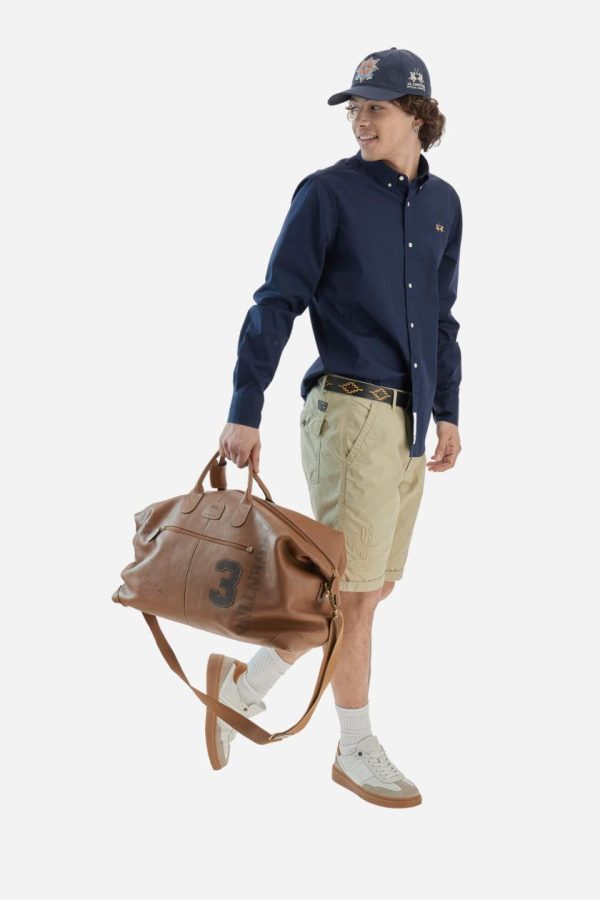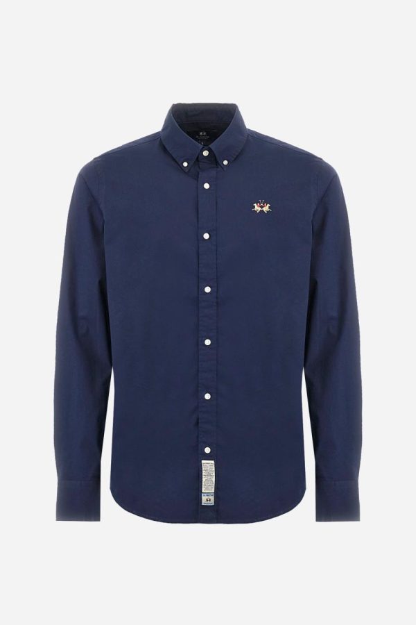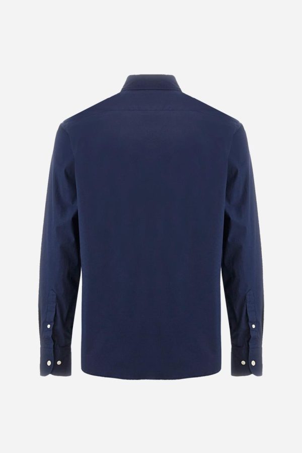 Experience exceptional comfort with this men’s long-sleeved shirt crafted from premium stretch cotton poplin. Features a classic button-down collar and woven labels at the bottom of the opening. The distinctive multicoloured logo is expertly embroidered over the heart in contrasting thread for a sophisticated touch. The contemporary slim fit delivers a sharp, modern silhouette that complements your style. The model is wearing a size L.