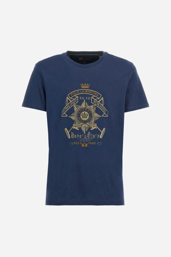 Elevate your casual wardrobe with this premium single-color men’s T-shirt crafted from soft cotton jersey. Features a comfortable crew neck with interior color-contrast detailing for added style. The standout front graphic showcases an impressive large Guards crest print, complemented by expertly embroidered La Martina branding for superior quality. Designed with a versatile regular fit that flatters every build. The model is wearing a size L.