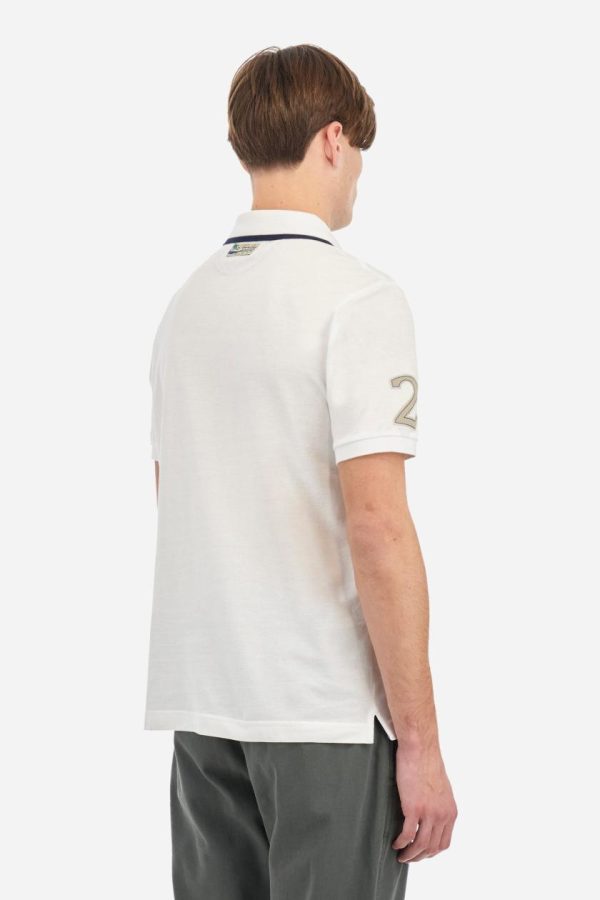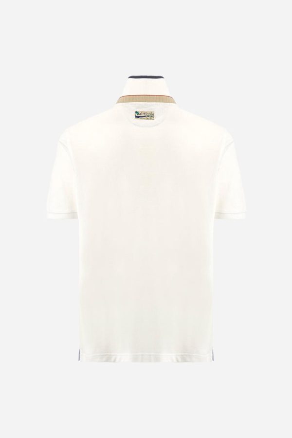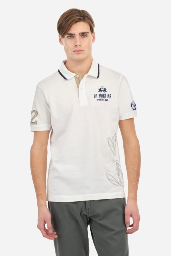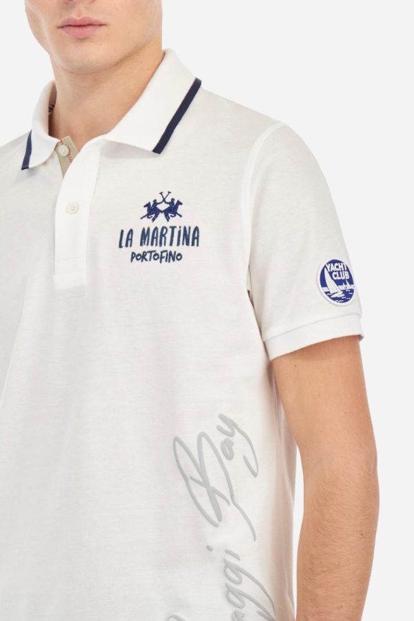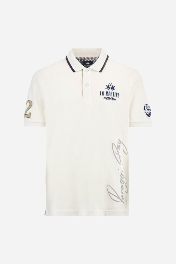 Experience premium craftsmanship with this men’s short-sleeved polo shirt made from high-quality cotton piqué. Features a convenient two-button fastening for easy wear. The collar and cuffs are crafted from tone-on-tone ribbed fabric for superior comfort. The collar includes a stylish contrasting band at the bottom, enhanced by a contrasting fabric panel inserted into the neckline under the collar, finished with precision red stitching. An elegant two-tone striped ribbon accents the inside collar, while the interior features a fabric panel with a contemporary geometric print. Both sleeves feature carefully applied fabric patches. The left side displays impressive raised vertical lettering celebrating Paraggi Bay beach, expertly embroidered in tone-on-tone thread. The distinctive logo is embroidered on the left chest alongside La Martina and Portofino lettering, all executed in contrasting thread for maximum visual impact. Designed with a comfortable regular fit that flatters every physique. The model is wearing a size L.