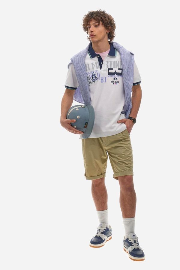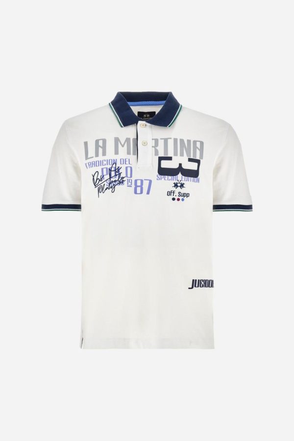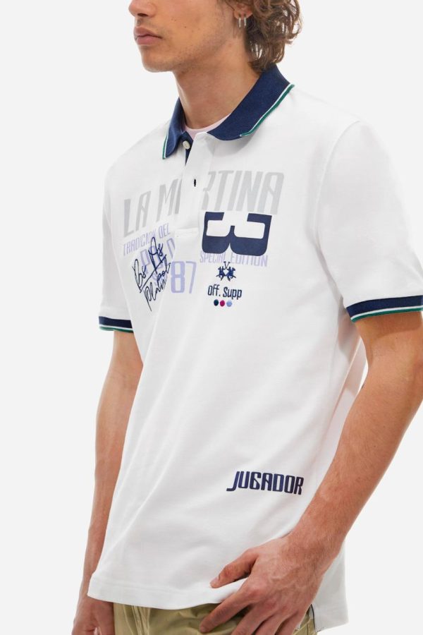 Elevate your casual wardrobe with this premium men’s polo shirt crafted from superior stretch piqué fabric. The sophisticated design features a two-button placket with elegant contrasting interior detailing. The contrasting ribbed collar and cuffs are accented with vibrant multicolored stripes, while the chest showcases artistic prints and premium embroidered details. The back features bold graphics and a structured yoke seam for enhanced fit. Signature logo embroidery on the left chest adds a touch of luxury. Designed with a classic regular fit for all-day comfort. Model shown wears size L for reference.