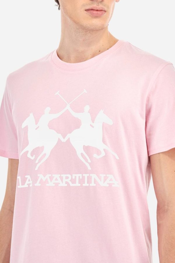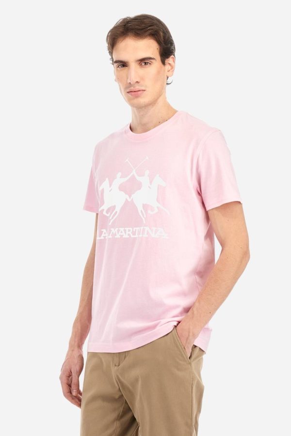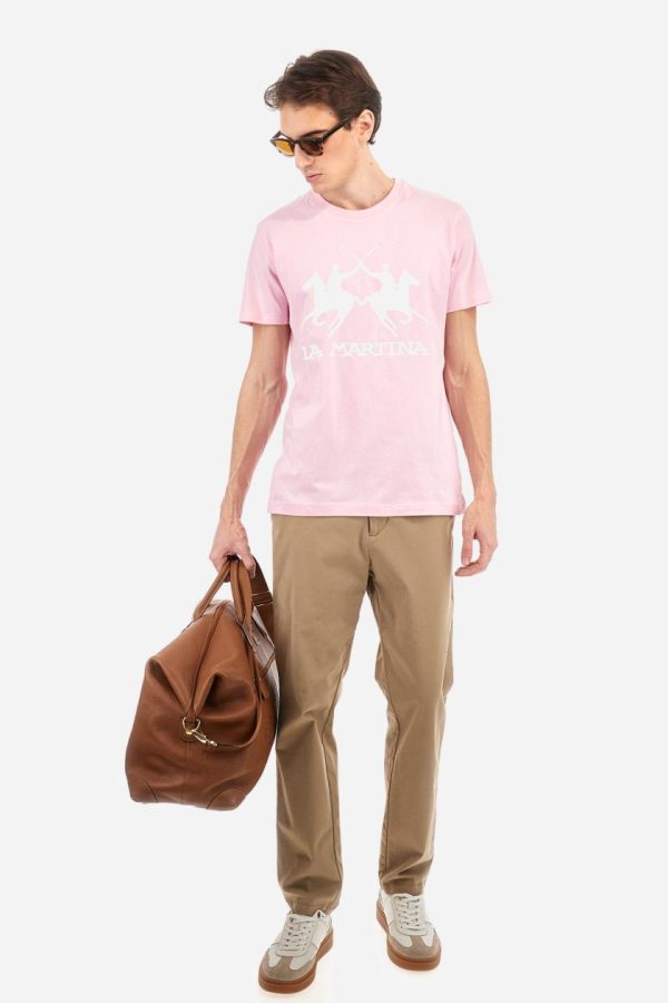Elevate your casual wardrobe with this premium men’s short-sleeved T-shirt featuring a classic crew neck and solid color design. The bold printed logo makes a stylish statement while the 100% cotton construction ensures all-day comfort. Perfect for pairing with your favorite trousers for a modern, put-together look. The model is 187 cm tall and wears a size L.