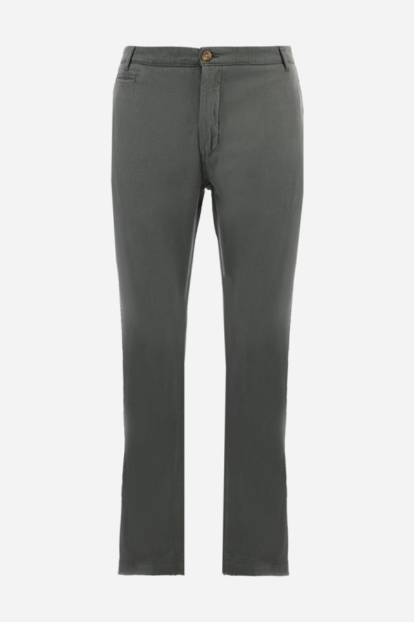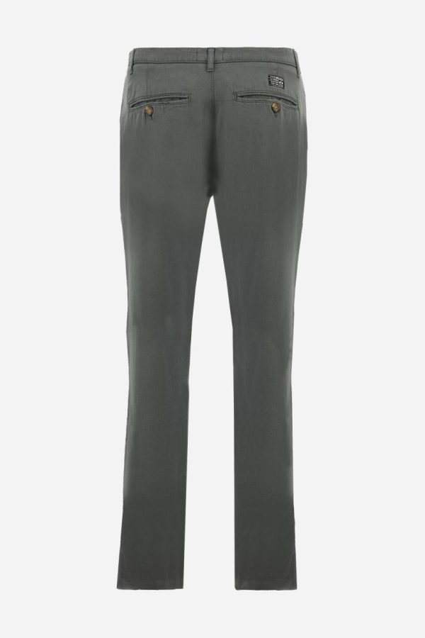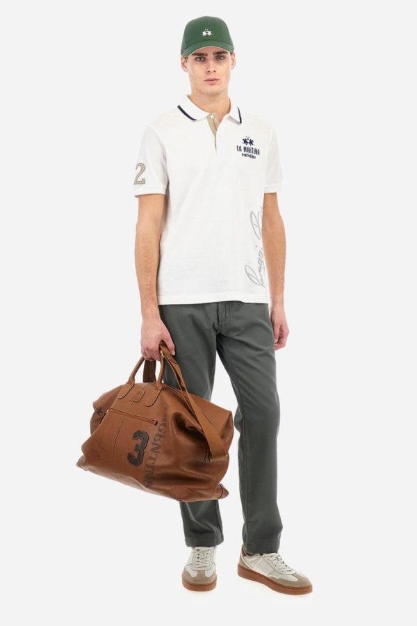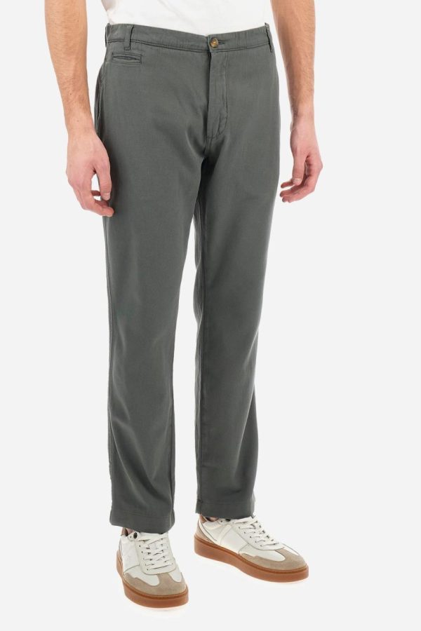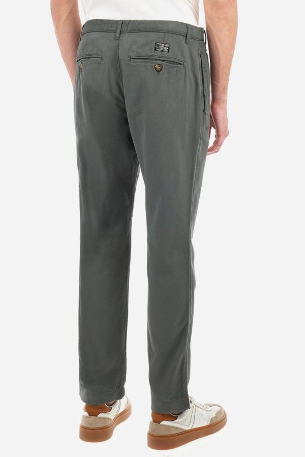 Elevate your wardrobe with these refined single-color chino trousers crafted from premium cotton and linen canvas. Features a classic straight leg design with secure zip fastening and elegant faux horn button closure. Practical side pockets are seamlessly integrated, while a convenient coin pocket sits discreetly under the front strap. The back showcases double-welted pockets secured with visible faux horn buttons. Finished with the distinctive La Martina logo on a fabric patch at the back. Designed for everyday comfort with a versatile regular fit. The model is wearing a size 33.