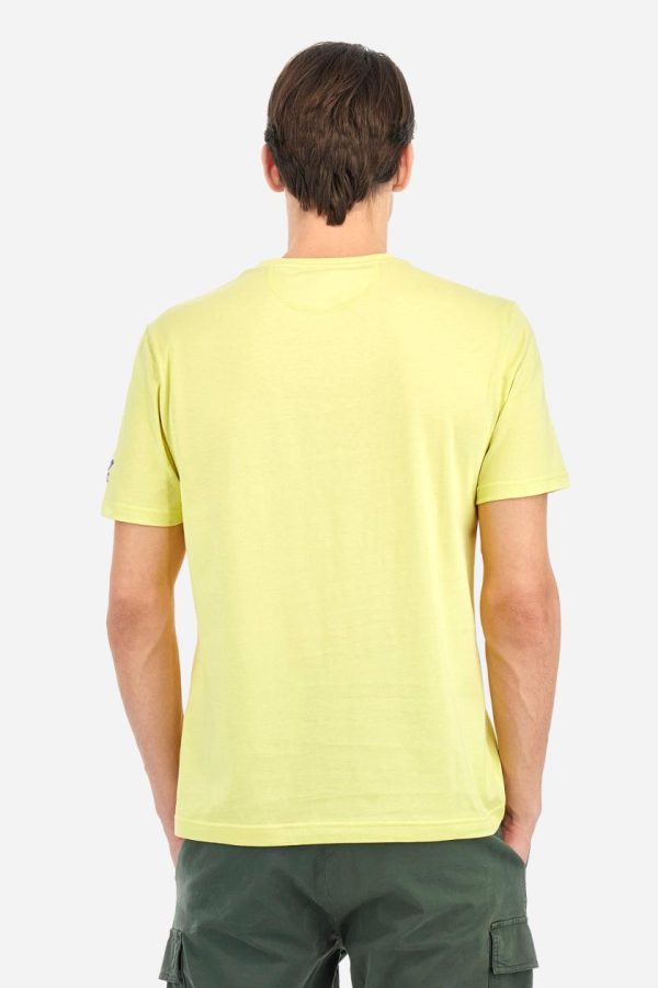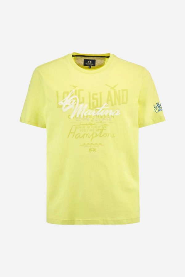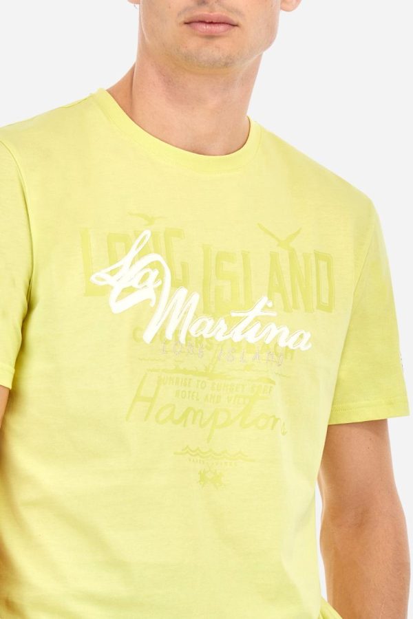 Experience premium comfort with this men’s cotton jersey short-sleeved T-shirt. The refined ribbed crew neck includes interior detailing with a grey melange jersey crescent and contrasting color ribbon for added sophistication. The chest features an elegant water print with subtle tone-on-tone white lettering celebrating the Hamptons inspiration. The left sleeve showcases exquisite embroidery with contrasting thread for a distinctive touch. Prominent La Martina logo and branding complete the front design. Regular fit ensures comfortable, versatile styling. Model shown wears size L for reference.