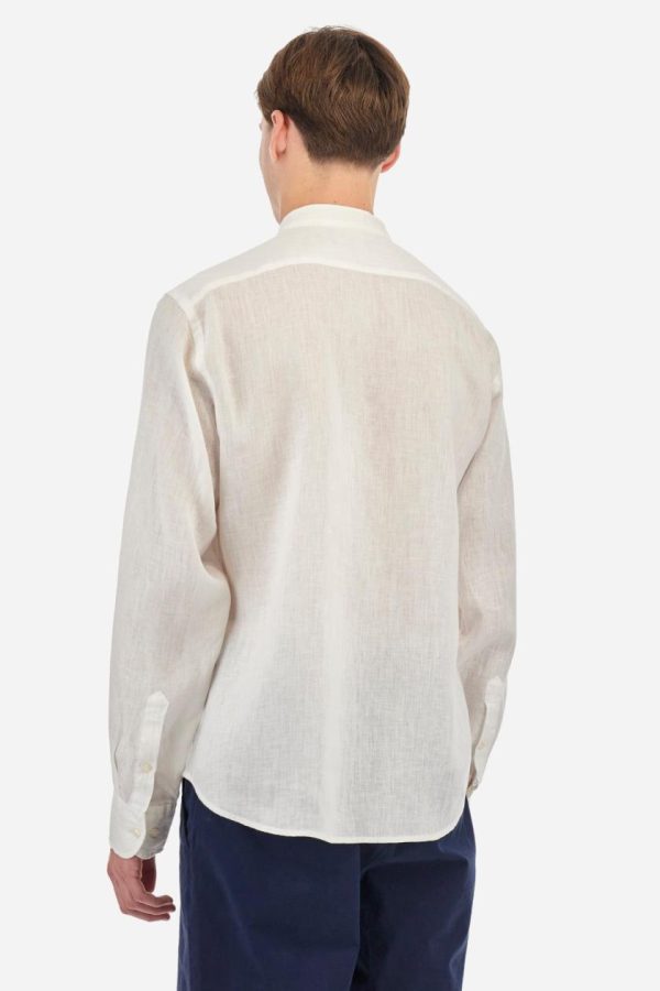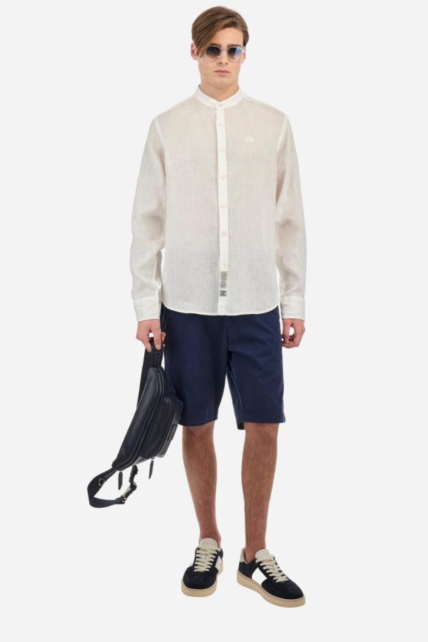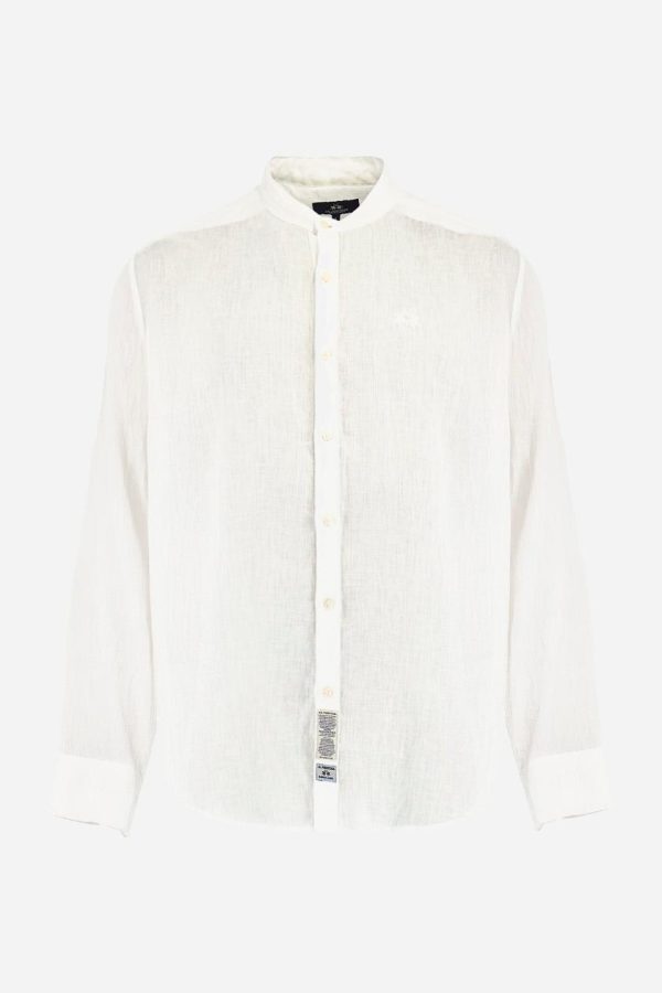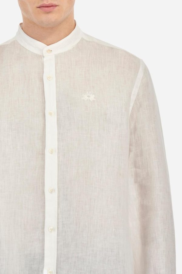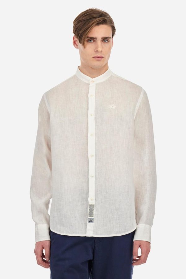 Elevate your wardrobe with this premium men’s long-sleeved shirt crafted from breathable linen canvas. The refined mandarin collar delivers sophisticated style while woven labels showcasing the brand’s certification and Argentine heritage add distinctive character. The subtle logo embroidery over the heart provides understated elegance. Designed with a versatile regular fit that complements any body type. The model is wearing a size L.