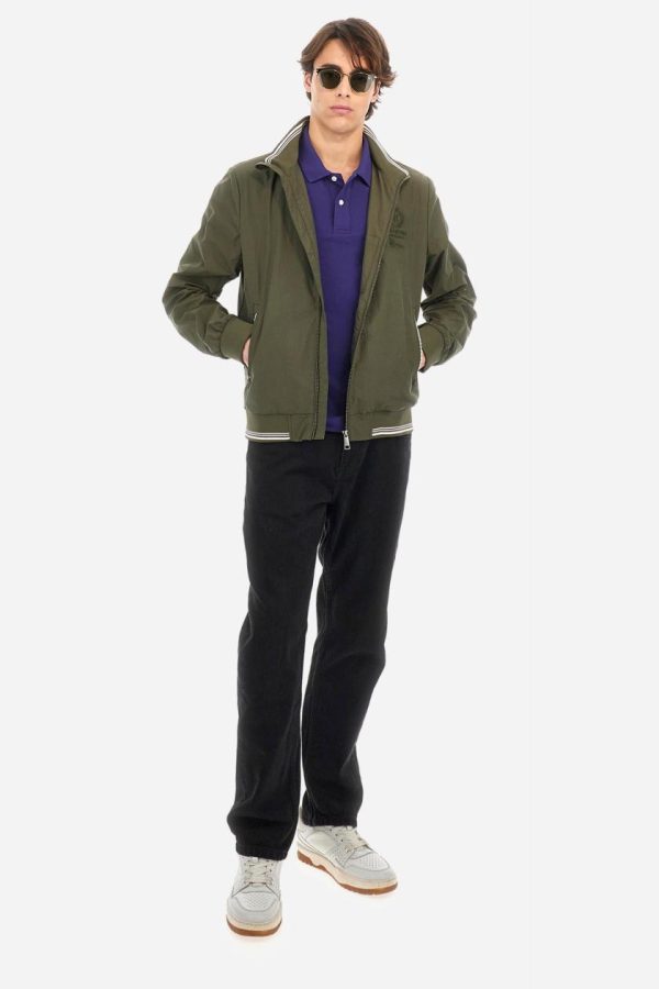 - Collar and cuffs are made from tone-on-tone ribbed fabric, with a contrasting fabric panel under the collar featuring embroidered multicoloured lettering