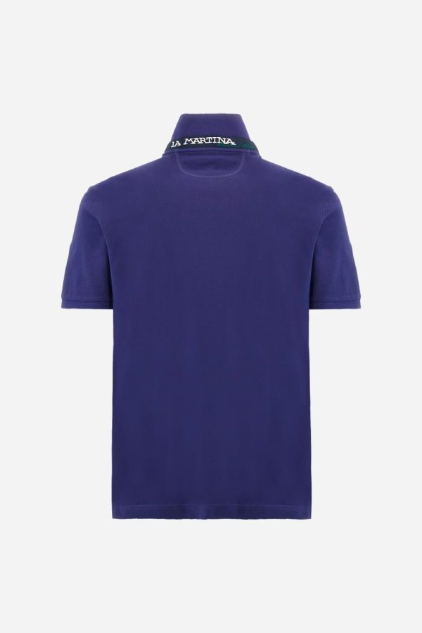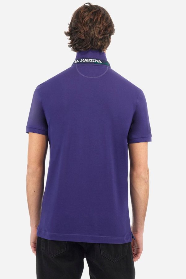 Elevate your casual wardrobe with this premium men’s short-sleeved polo shirt crafted from superior stretch piqué fabric. Features a sophisticated two-button fastening and refined collar and cuffs made from tone-on-tone ribbed fabric. The distinctive contrasting fabric panel under the collar showcases exquisite embroidered multicoloured lettering, while the signature logo is elegantly embroidered on the left chest in contrasting thread. Designed with a modern slim fit that provides a polished, tailored appearance. The model is wearing a size L.