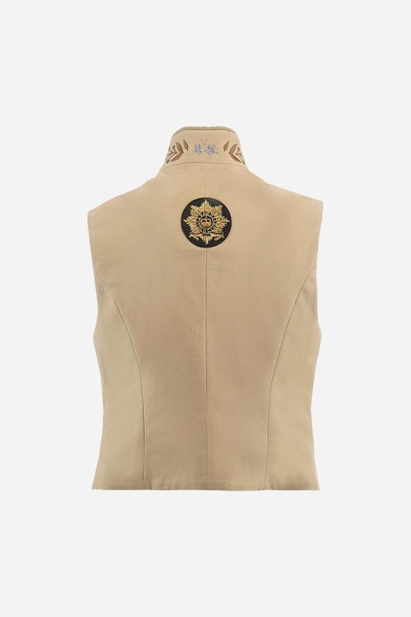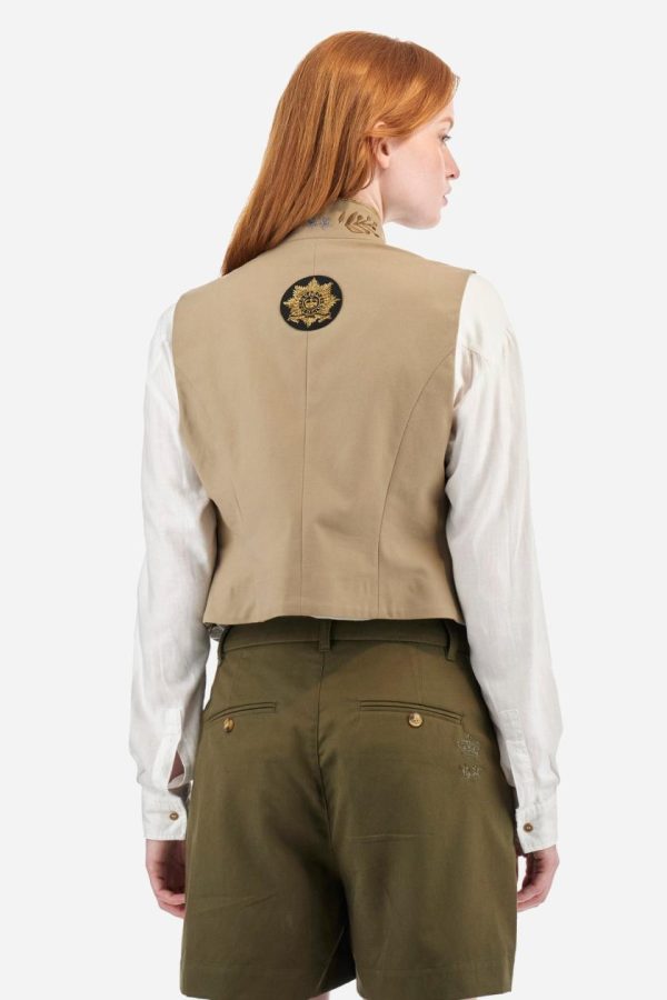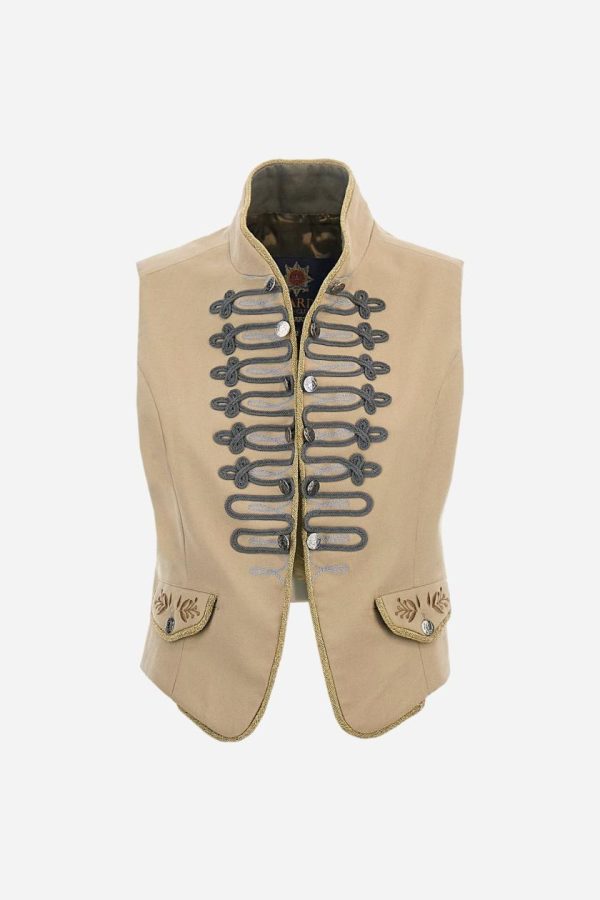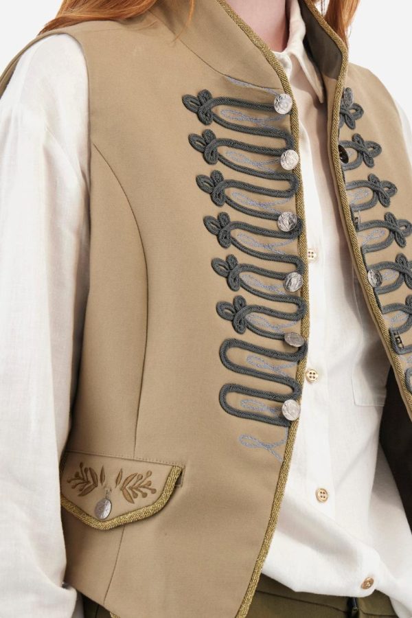Women’s gilet made of cotton twill. Stand-up collar. The opening is free, without hooks or buttons, and is trimmed with gold piping. The front pockets are decorative, with floral embroidery, and fasten with a metal button. On the front, the cornely decoration with colour-contrasting colour trim is alternated with small chain embroideries and finished with decorative metal buttons. Short, tight fit. The model is wearing a size 40.
