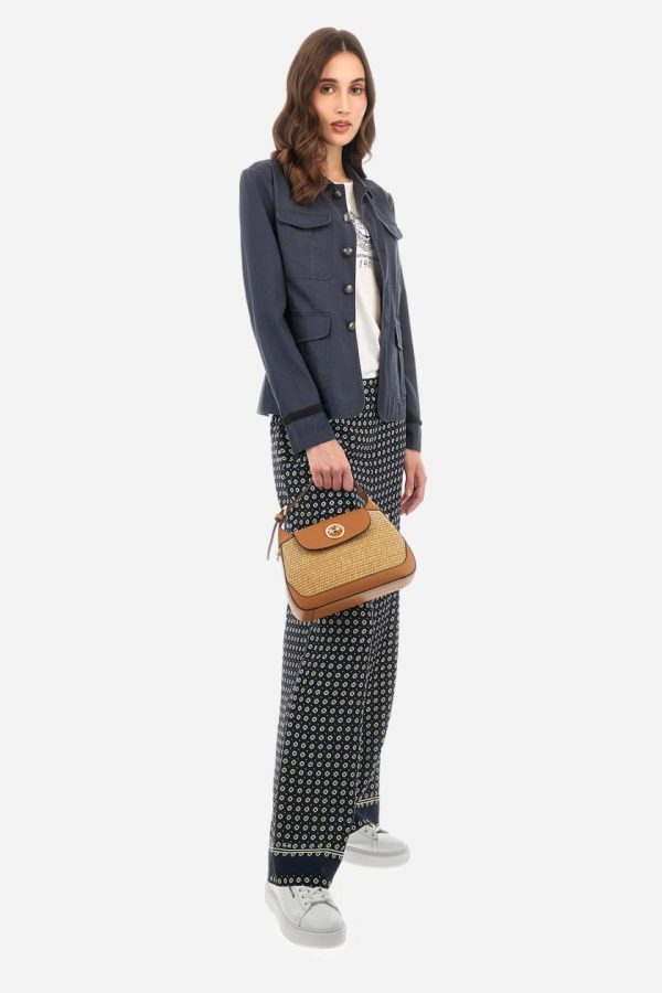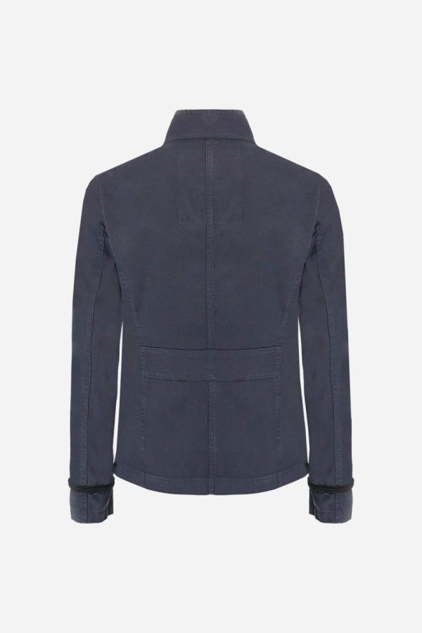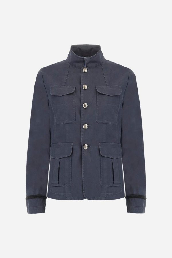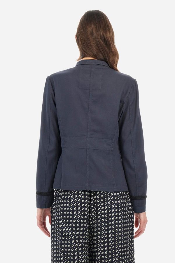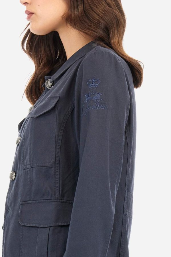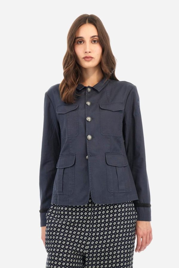 Women’s long-sleeved safari jacket in a single colour, made of a cotton-modal blend drill.The front fastens with 5 metal buttons with heraldic motif. The front pockets are applied. Decorative braid-patterned trimmings are applied to the cuffs. The tone-in-tone logo graphic is embroidered on the left sleeve. Regular fit. The model is wearing a size 40.