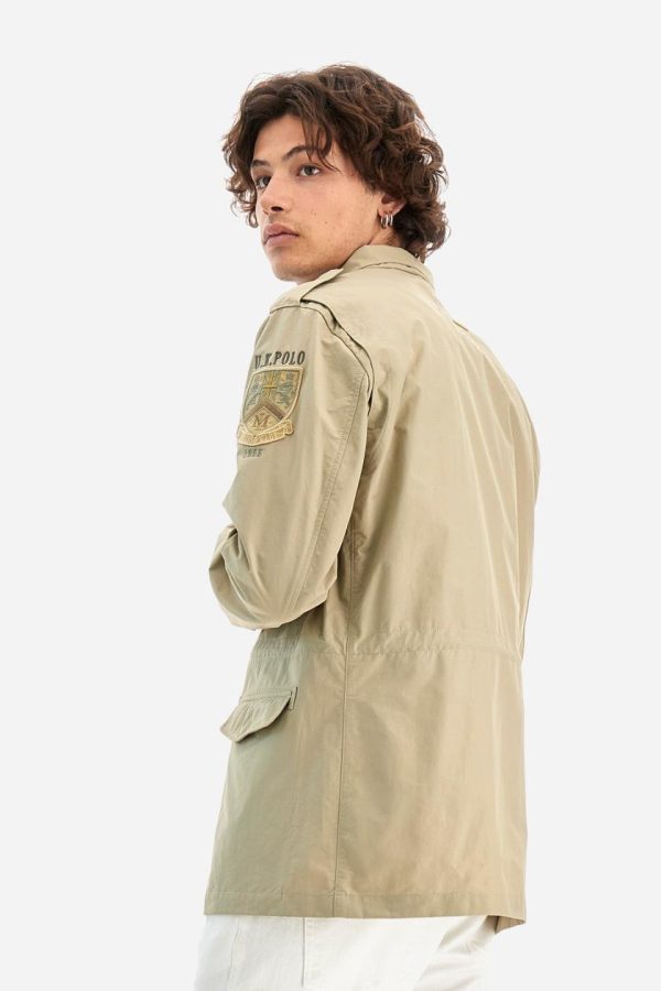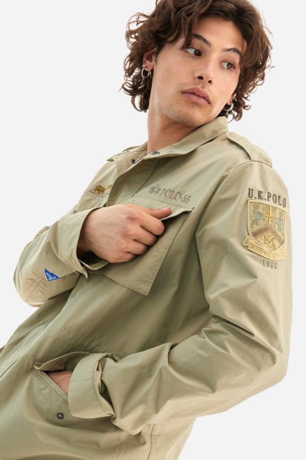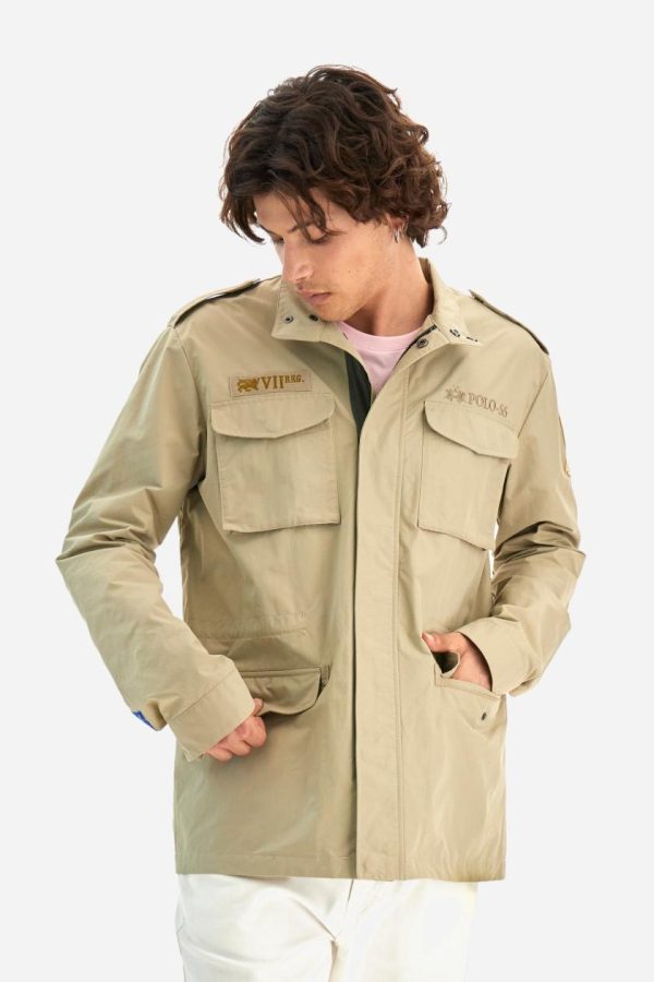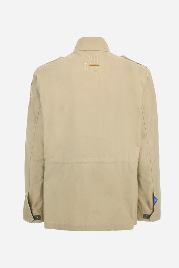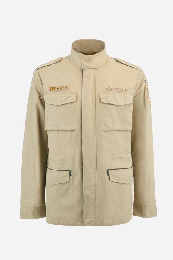 Men’s long-sleeved field jacket in a single colour, made of technical cotton and nylon fabric. Stand-up collar. Front fastening covered by a placket and featuring hidden snap buttons and zip. Frogs secured with pins on the shoulders. The front chest pockets are patch pockets and fasten with hidden snaps. Double welt pockets at the bottom. There is a drawstring waistband to adjust the fit. There is a patch with heraldic motifs on the sleeve. The logo is embroidered on the front. Regular fit. The model is wearing an Italian size 50.