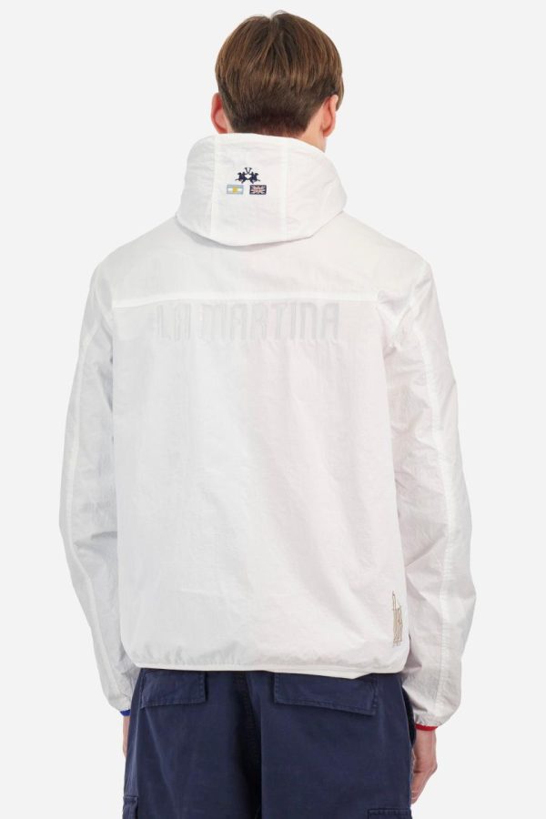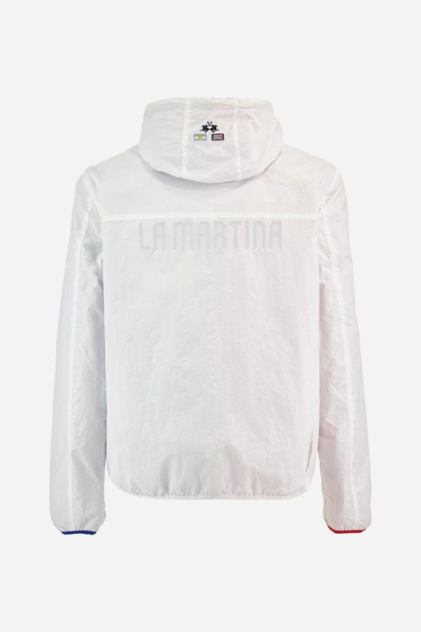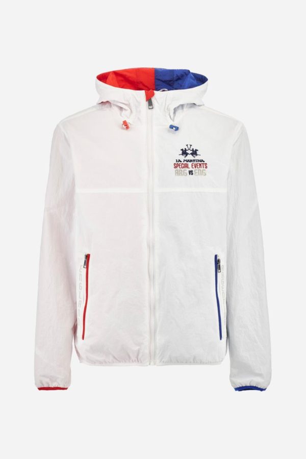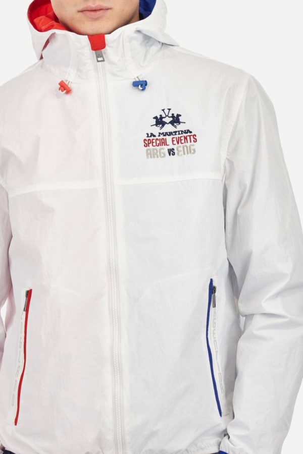 Men’s long-sleeved jacket in a single colour, with hood. Made of ckinckle nylon. Full-zip fastening. There is an internal lining in dual-tone nylon. Two-tone detailing is also present on the zips of the vertical pockets on the front, the cord clips on the hood and the elasticated piping at the cuff end. Adjustable hood on the opening, featuring an elastic drawstring. Glossy transfer print applied on the back. Multi-coloured embroidered graphics featured on the hood and left chest. The La Martina logo and lettering is embroidered on the front. Regular fit. The model is wearing a size L.