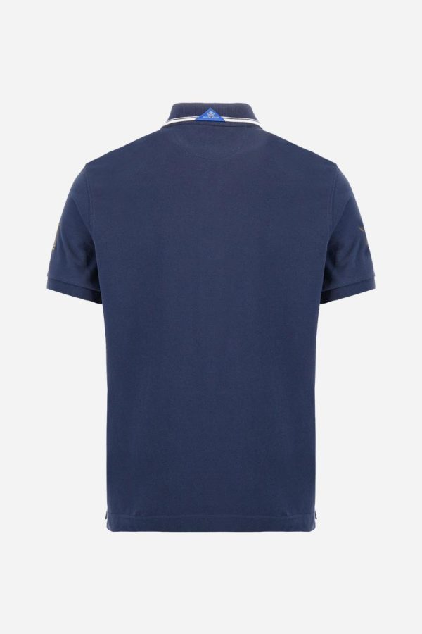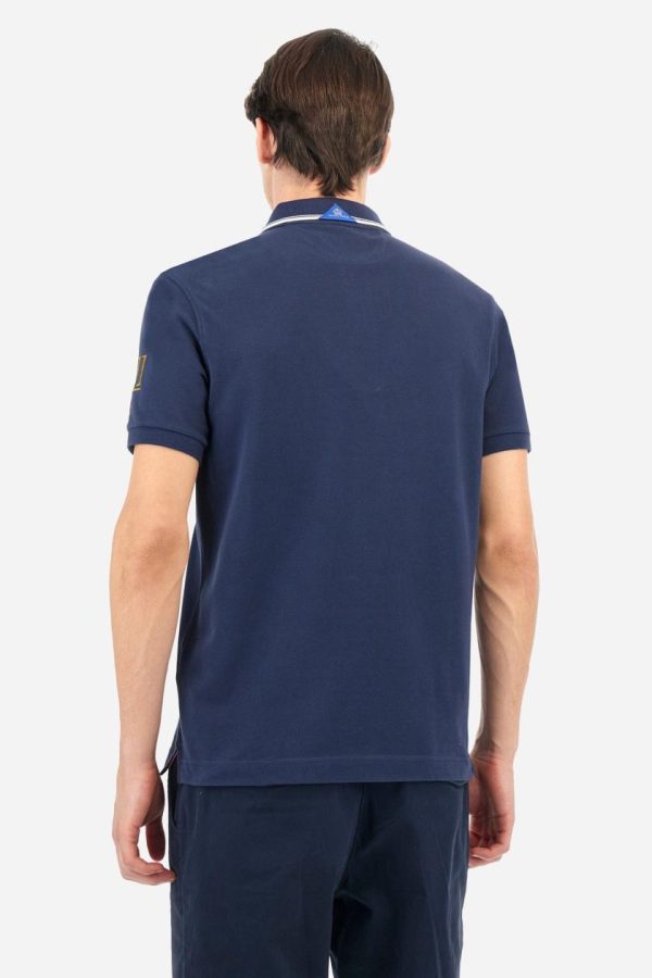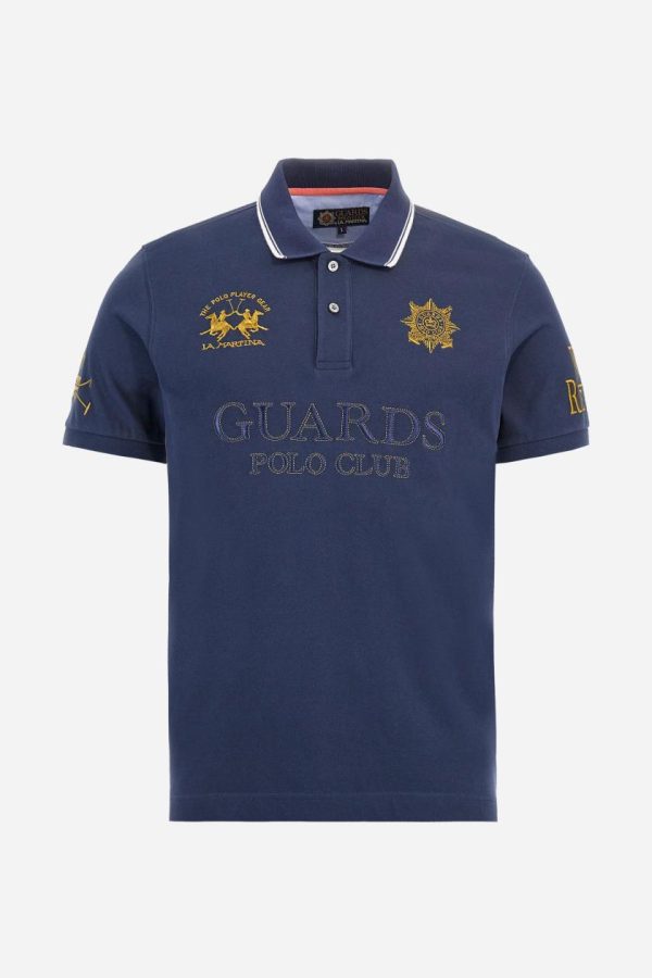 Men’s short-sleeved Guards polo shirt in a single colour, made of cotton piqué. Fastens with two buttons. The collar is ribbed with striped trim in a contrasting colour. The graphics on the chest and sleeves are all made using the embroidery technique. The central lettering on the chest is a 3D embroidery in the same colour as the base fabric. The large colour-contrasting logo is embroidered on the chest. The fit is regular. The model is wearing a size L.