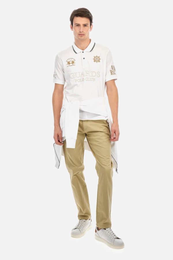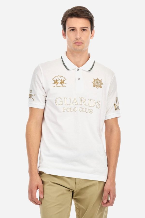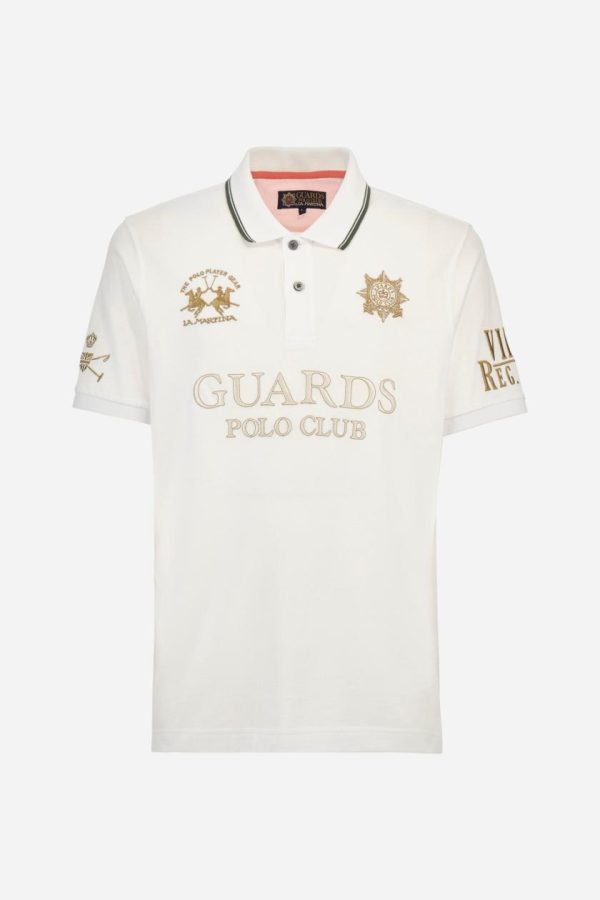 Men’s short-sleeved Guards polo shirt in a single colour, made of cotton piqué. Fastens with two buttons. The collar is ribbed with striped trim in a contrasting colour. The graphics on the chest and sleeves are all made using the embroidery technique. The central lettering on the chest is a 3D embroidery in the same colour as the base fabric. The large colour-contrasting logo is embroidered on the chest. The fit is regular. The model is wearing a size L.