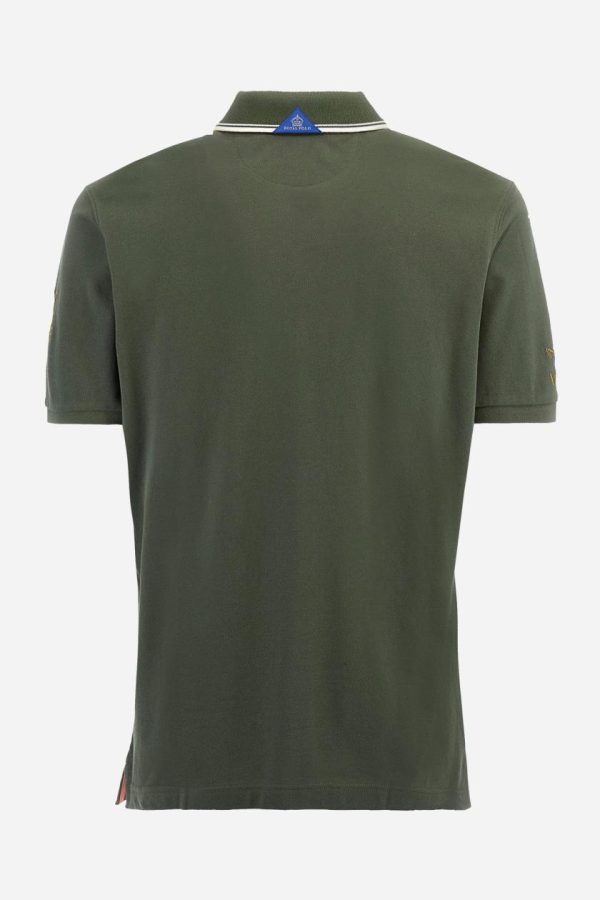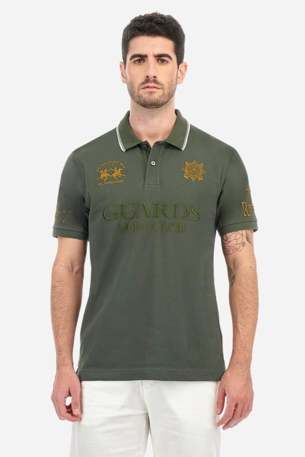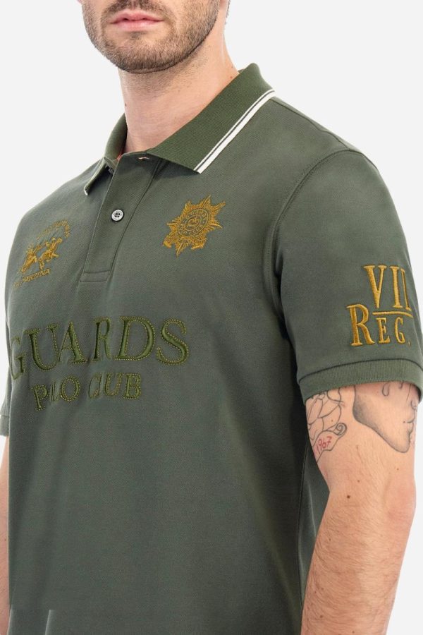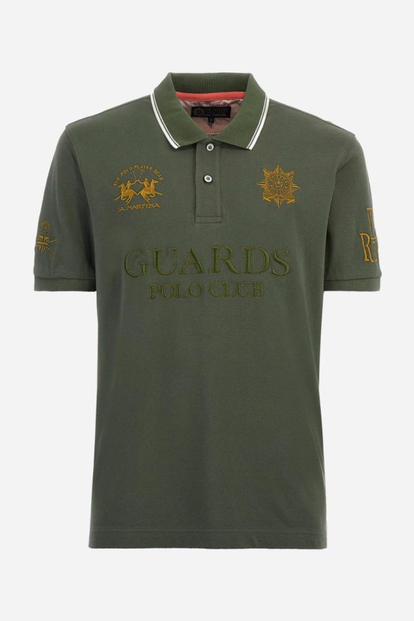 Men’s short-sleeved Guards polo shirt in a single colour, made of cotton piqué. Fastens with two buttons. The collar is ribbed with striped trim in a contrasting colour. The graphics on the chest and sleeves are all made using the embroidery technique. The central lettering on the chest is a 3D embroidery in the same colour as the base fabric. The large colour-contrasting logo is embroidered on the chest. The fit is regular. The model is wearing a size L.