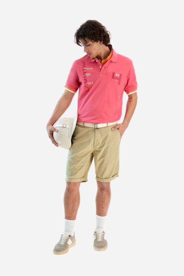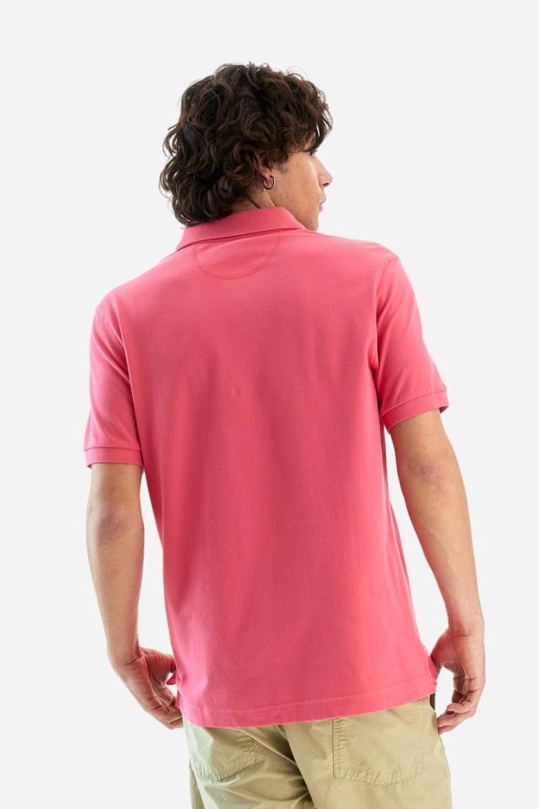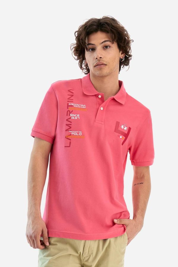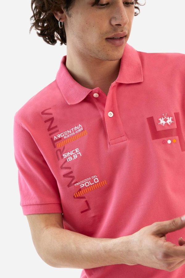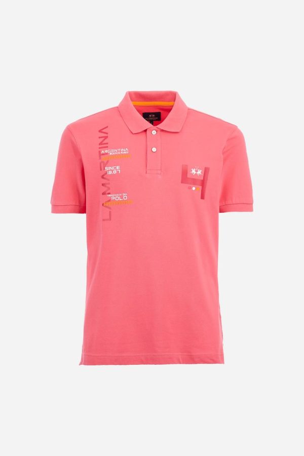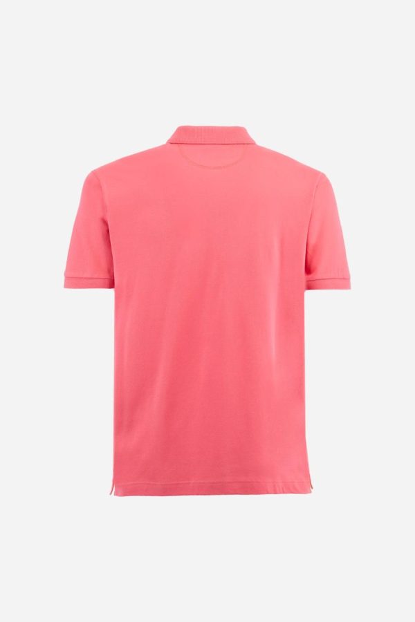 Short-sleeved, single-colour men’s polo shirt made of stretch cotton piqué. Fastens with two buttons. Rib collar and cuffs in matching tone. The graphics and applications on the chest are made with mixed techniques, namely printing and embroidery. The logo is embroidered on the chest, left side. The fit is regular. The model is wearing a size L.