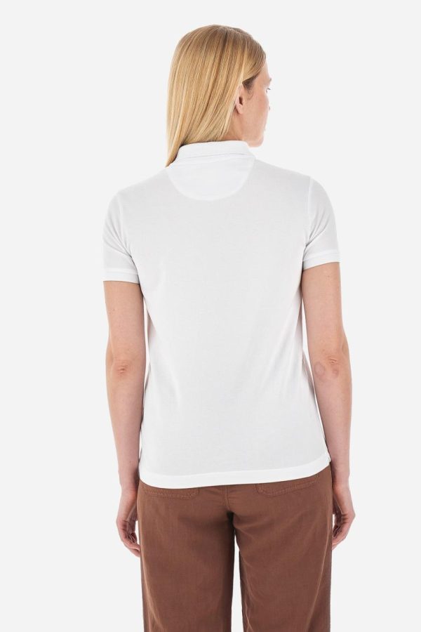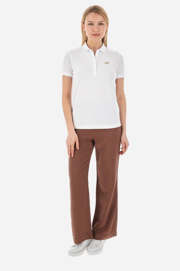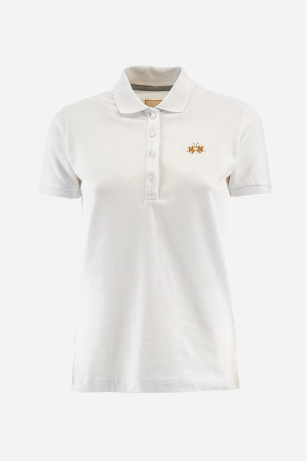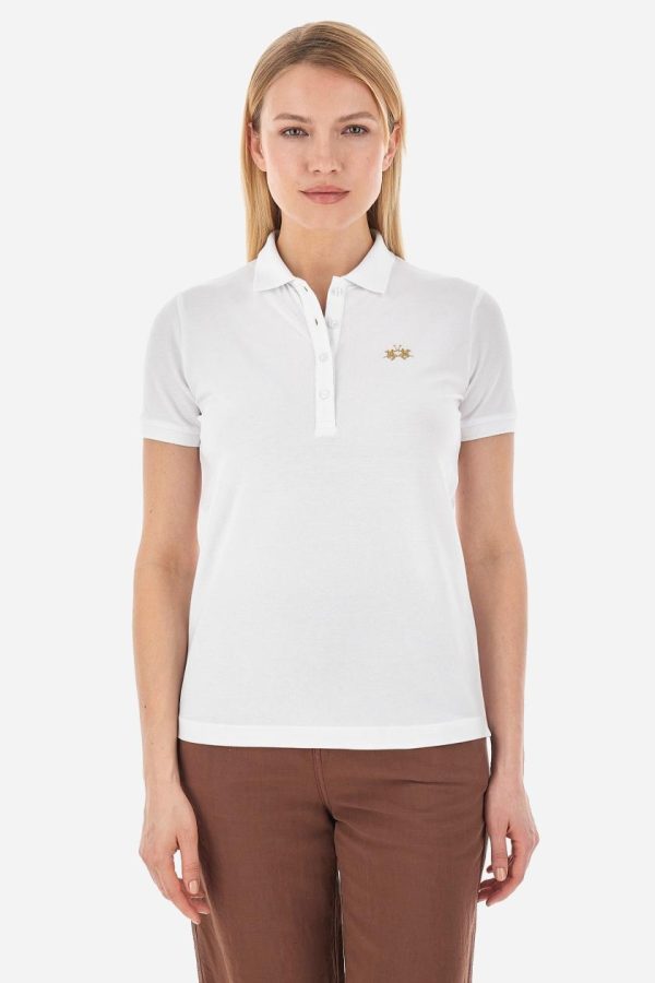 Women’s short-sleeved polo shirt in soft stretch cotton with a regular fit. Neckline with 4-button placket and classic collar. The La Martina logo is embroidered in relief in a contrasting colour on the front side. The regular fit suits every body type. To be combined with trousers or Bermuda shorts, ideal for leisure time. The model is 174 cm tall and wears a size S.