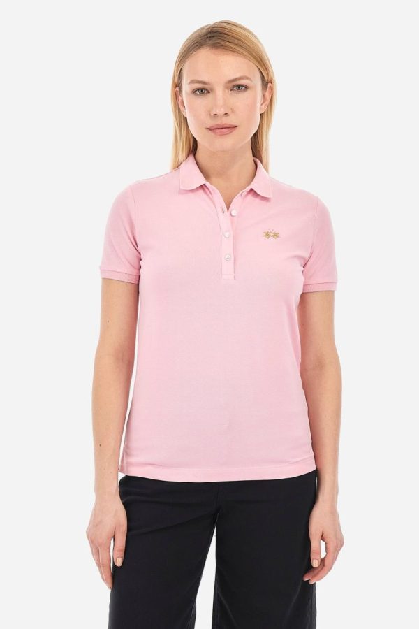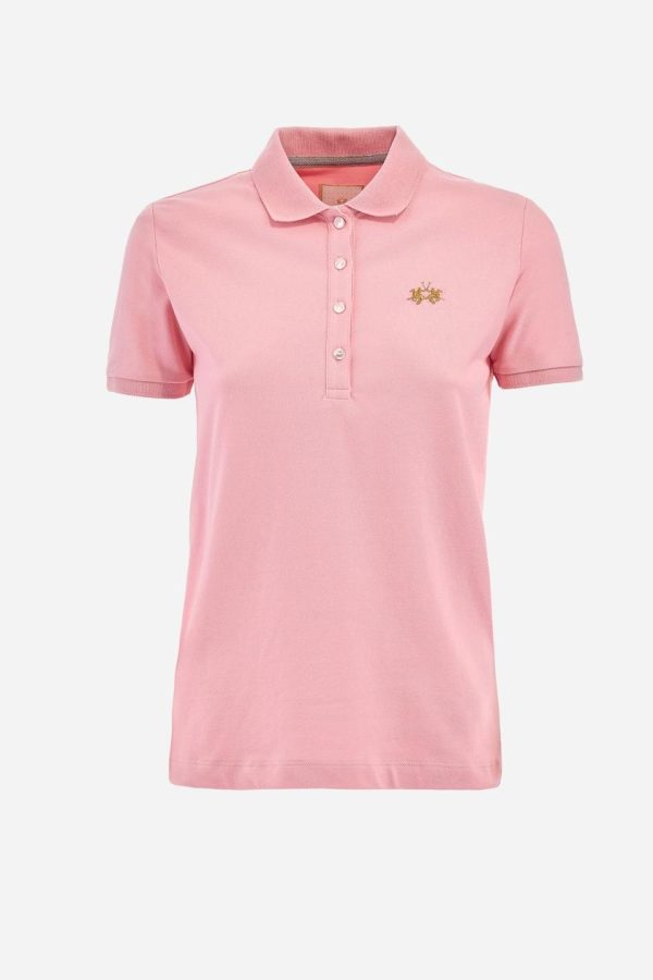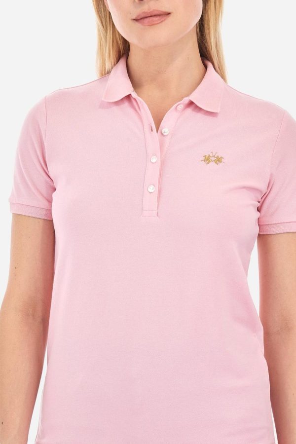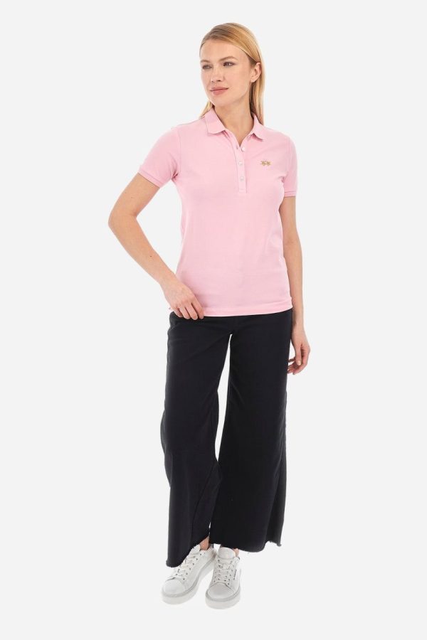 Women’s short-sleeved polo shirt in soft stretch cotton with a regular fit. Neckline with 4-button placket and classic collar. The La Martina logo is embroidered in relief in a contrasting colour on the front side. The regular fit suits every body type. To be combined with trousers or Bermuda shorts, ideal for leisure time. The model is 174 cm tall and wears a size S.