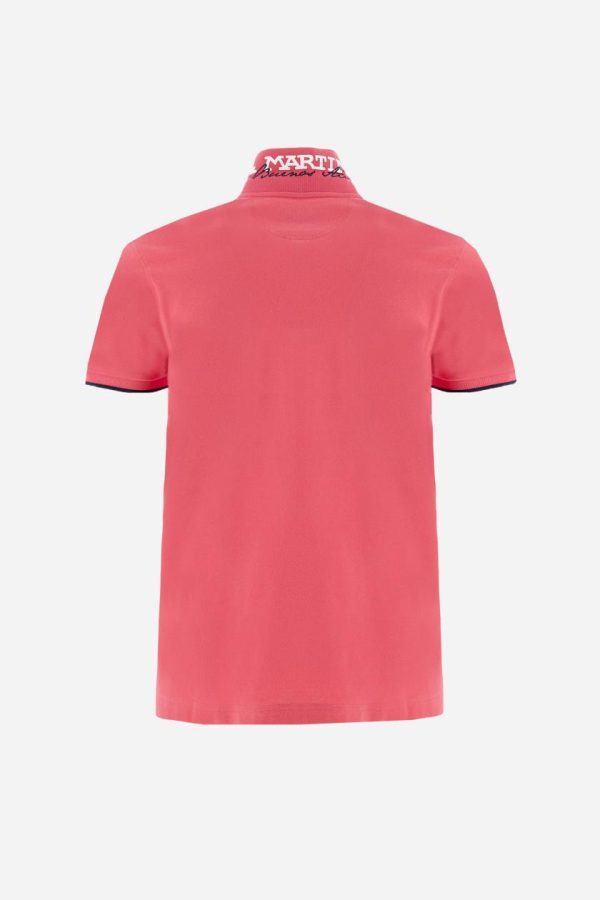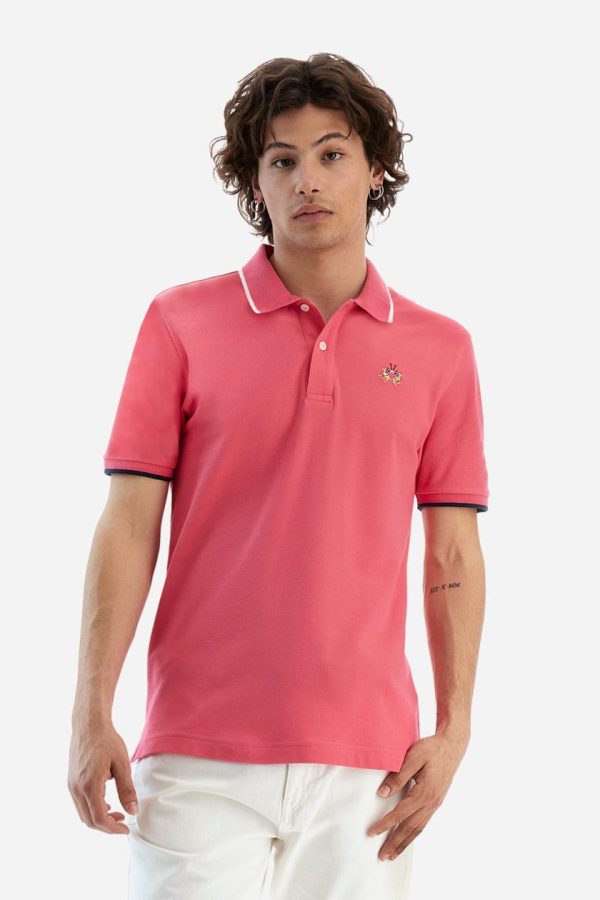 Short-sleeved, single-colour men’s polo shirt made of stretch cotton piqué. Fastens with two buttons. The collar and cuffs are ribbed, and there is a colour-contrasting trim at the bottom of the collar. Inside the collar there is a grosgrain ribbon of a different shade. The logo is embroidered on the chest in a contrasting colour. The fit is slim. The model is wearing a size L.